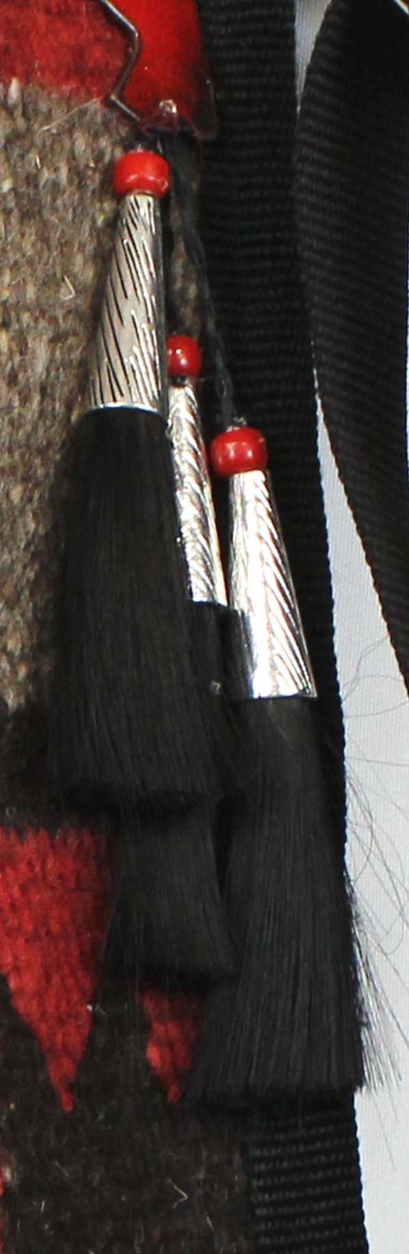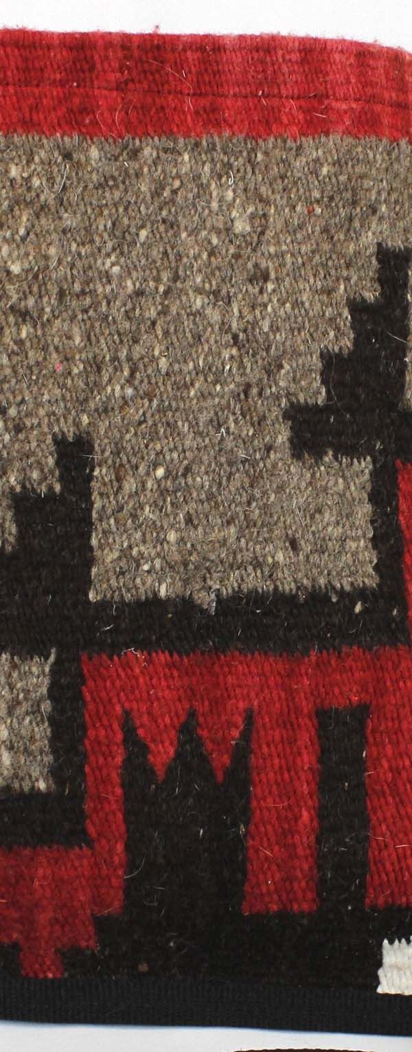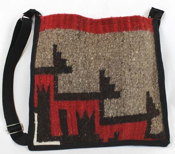 Beautiful Quail Ridge Studios One of a Kind Navajo Wool Textile Shoulder Bag by George Smith, measures 14'' x 15'', embellished with 3 metal capped tassels and an enamel horse head pin, 2 inside pockets, zippered inside pocket, shoulderstrap is adjustable