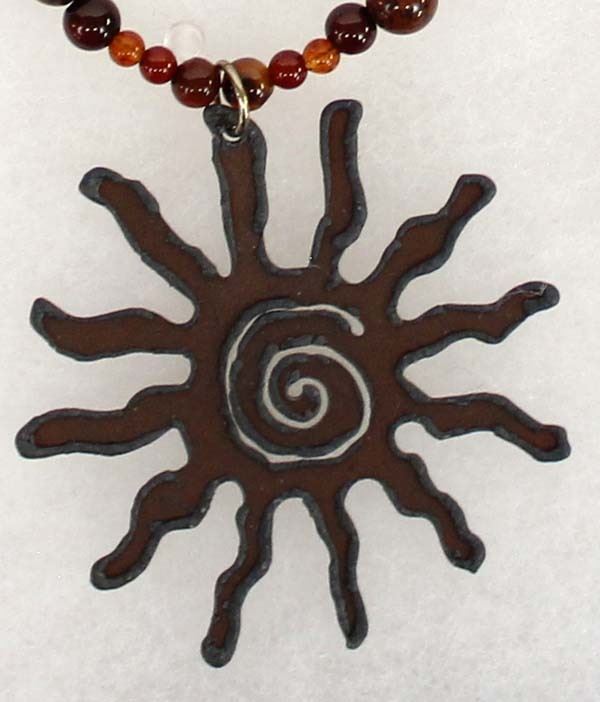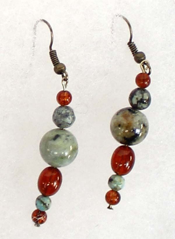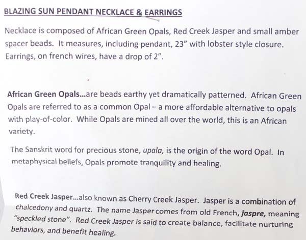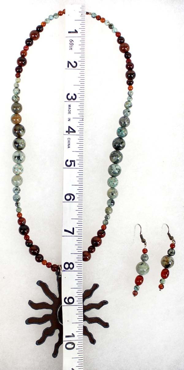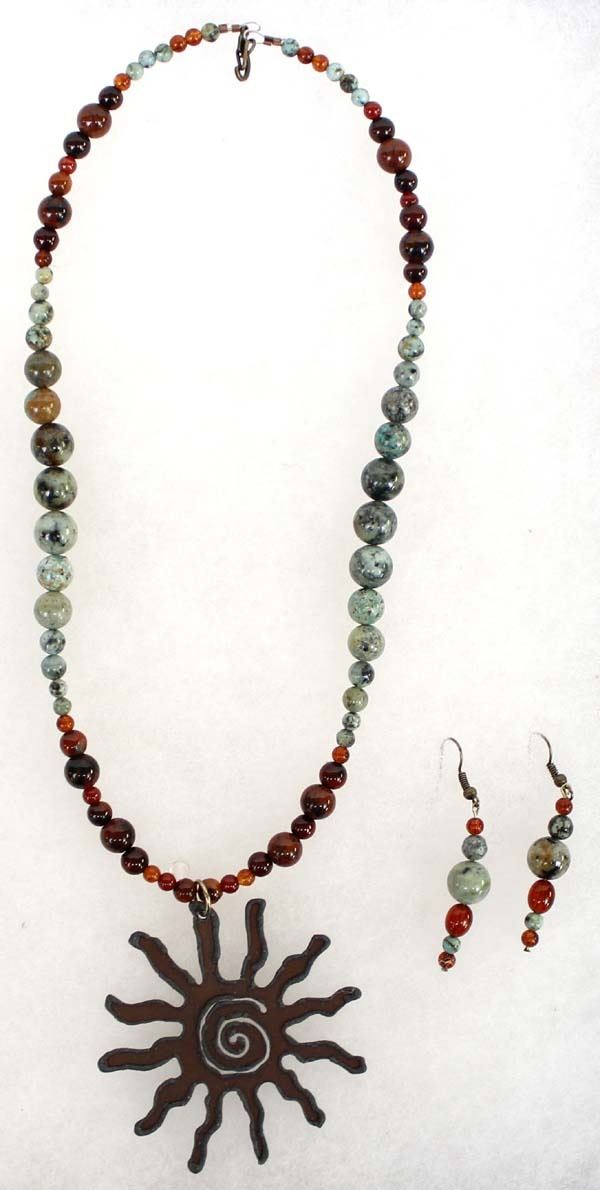Quail Ridge Studios One of a Kind Blazing Sun Pendant Necklace and Earrings by Larry McLellan of Silver City, NM, necklace is composed of African Green Opals, Red Creek Jasper, and small spacer beads, it measures, including pendant 23'', lobster style closure, earrings, on French wires have a drop of 2'', The magic of the Desert Southwest is timeless in its display of open landscapes, sunrise and sunset colors with infinite possibilities of artistic expression. The design studio of Quail Ridge was founded on these possibilities, forging an endless variety of earthen gems to their metallic counterparts. The artist, Larry McLellan, designs jewelry contemporary in style, while maintaining elements of native designs.