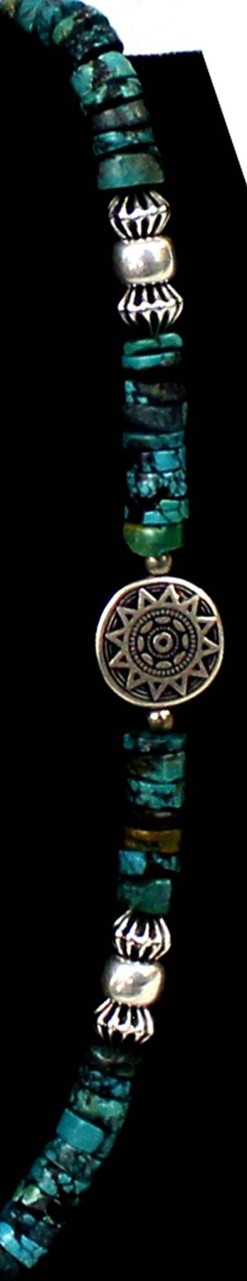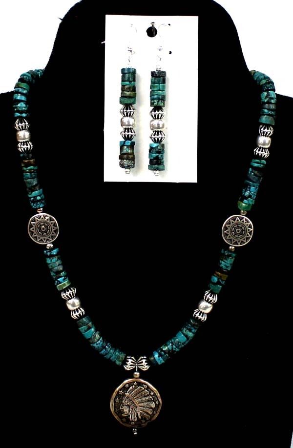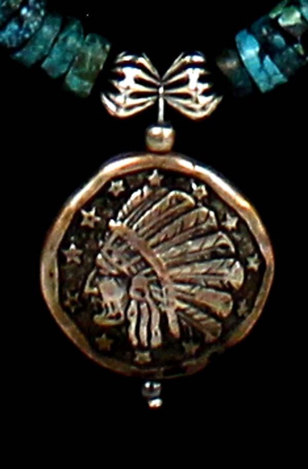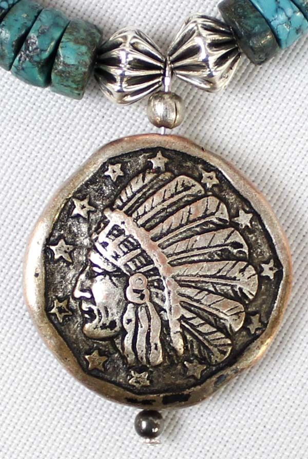 Quail Ridge Studios One of a Kind Pendant Choker and Earrings by Larry McLellan, Indian head coin replica pendant, 8mm green turquoise heishi beads, silver pony beads and antique silver bicone corrugated beads as spacers, 2 Native American style round silvertone waqr shield beads, measures 18'', 21'' with pendant, matching earrings on silver French wires with a drop of 2.75'', The magic of the Desert Southwest is timeless in its display of open landscapes, sunrise and sunset colors with infinite possibilities of artistic expression. The design studio of Quail Ridge was founded on these possibilities, forging an endless variety of earthen gems to their metallic counterparts. The artist, Larry McLellan, designs jewelry contemporary in style, while maintaining elements of native designs.
