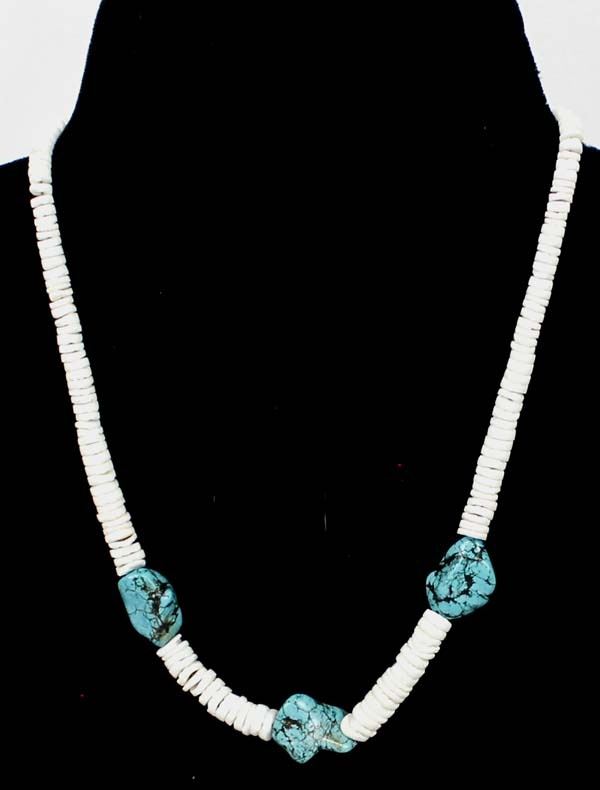 Quail Ridge Studios One of Kind Graduated Shell Heishi & Campitos Mine Turquoise Nugget Necklace by Larry McLellan, measures 17''L end to end, largest nugget measures 7/8''L, The magic of the Desert Southwest is timeless in its display of open landscapes, sunrise and sunset colors with infinite possibilities of artistic expression. The design studio of Quail Ridge was founded on these possibilities, forging an endless variety of earthen gems to their metallic counterparts. The artist, Larry McLellan, designs jewelry contemporary in style, while maintaining elements of native designs.