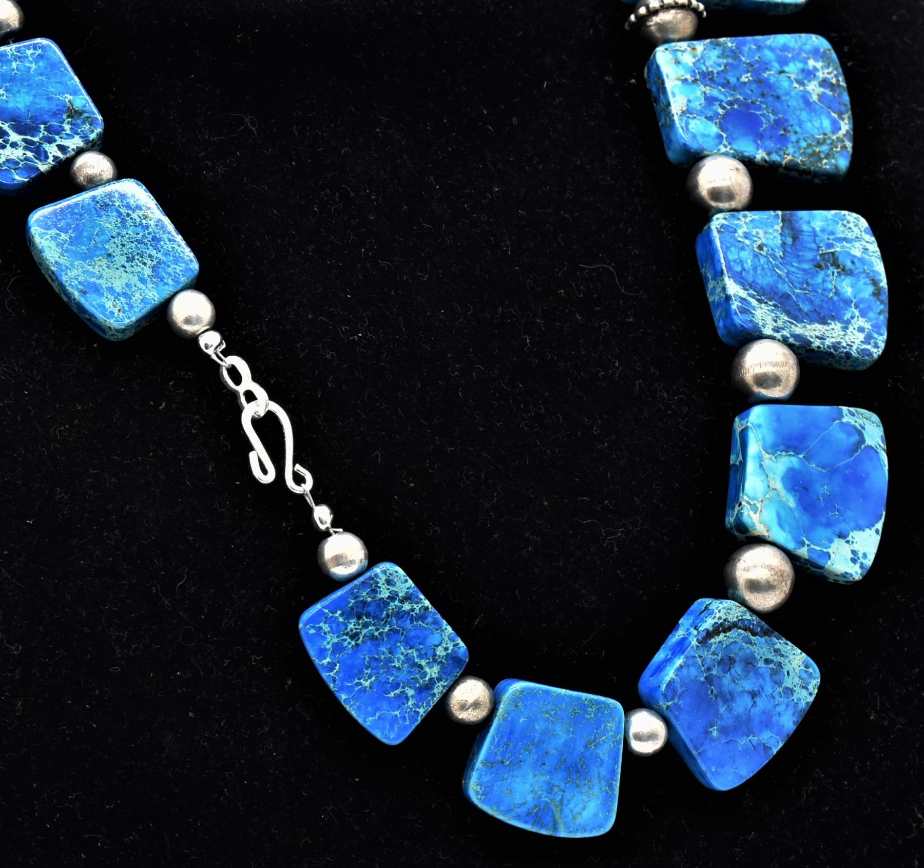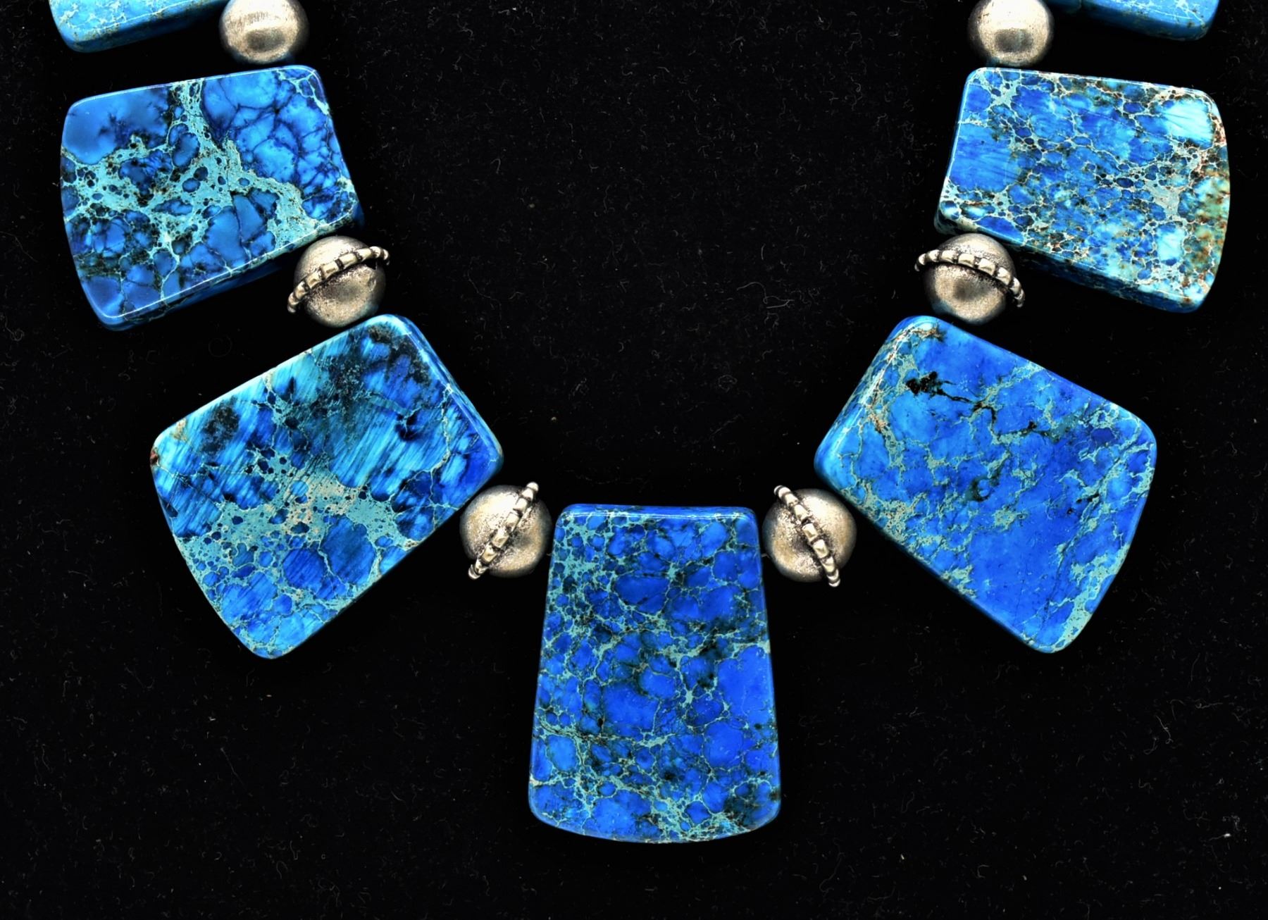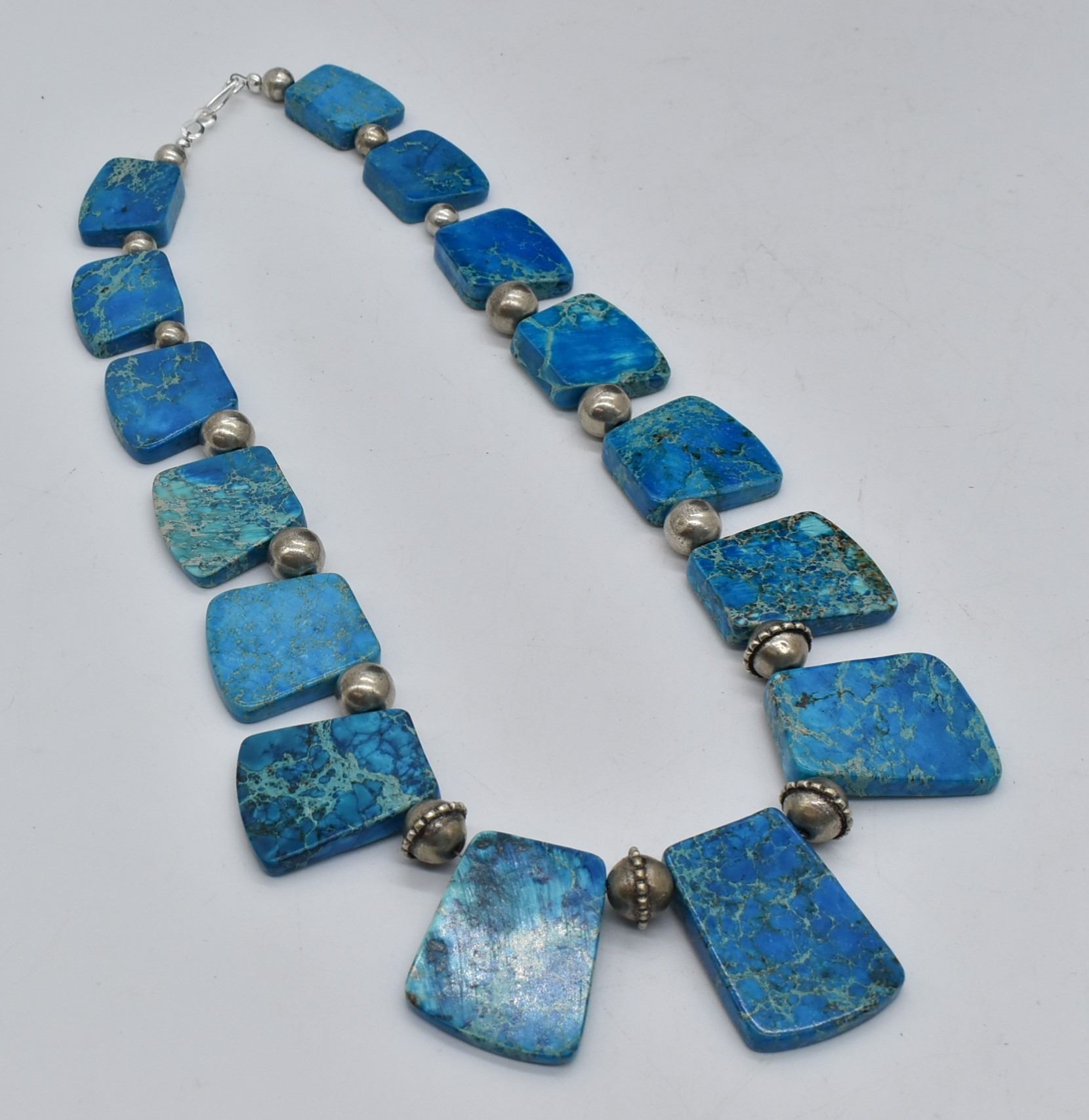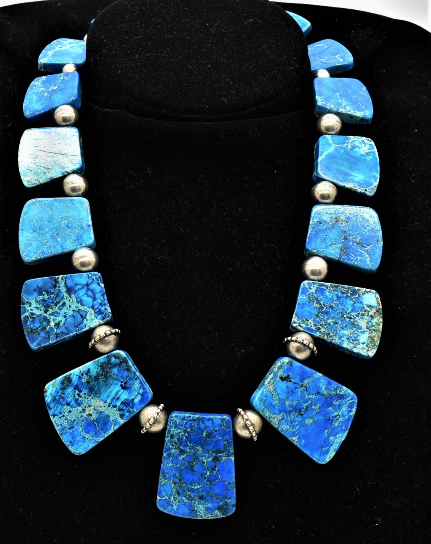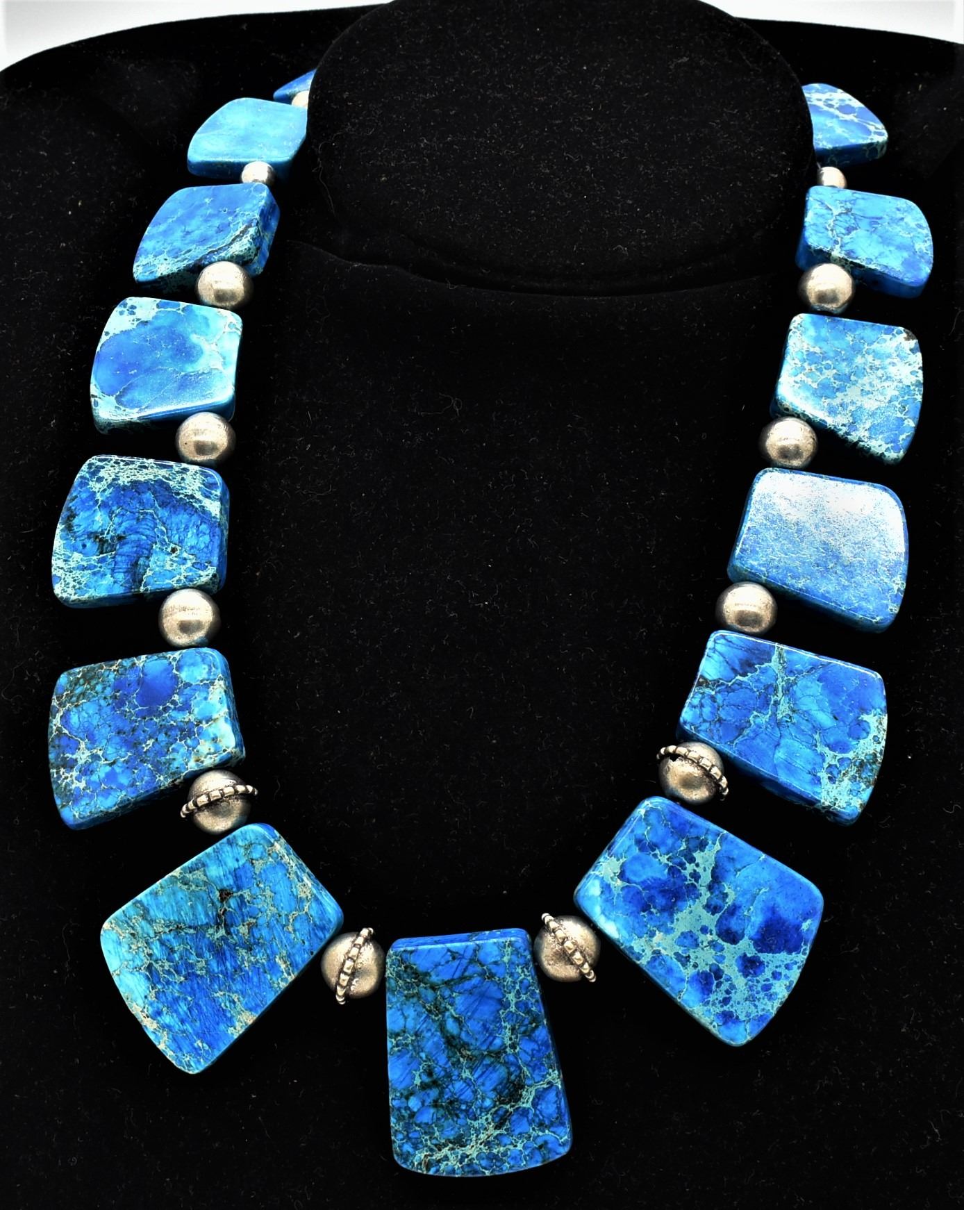 Quail Ridge Studios Trapezoid Bead Necklace by Larry McLellan, turquoise sea sediment Jasper trapezoid slab/slice beads, handmade silver beads measuring from 10mm to 8mm, necklace measures 22'' with a hook and eye closure, The magic of the Desert Southwest is timeless in its display of open landscapes, sunrise and sunset colors with infinite possibilities of artistic expression. The design studio of Quail Ridge was founded on these possibilities, forging an endless variety of earthen gems to their metallic counterparts. The artist, Larry McLellan, designs jewelry contemporary in style, while maintaining elements of native designs.