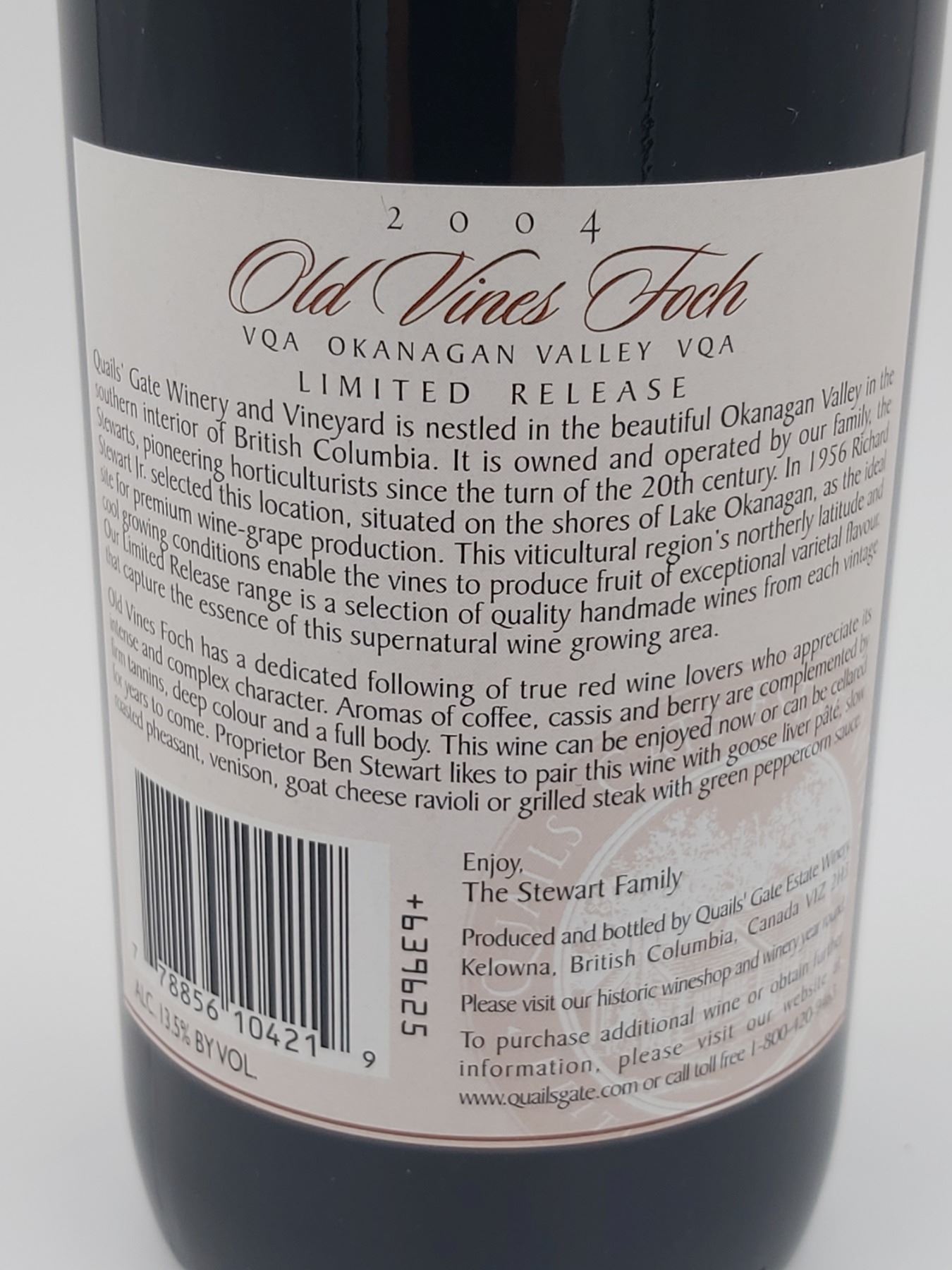 Quails Gate Winery O.V.F. Reserve Old Vines Foch Reserve Red Wine 2004 Vintage 15.0%