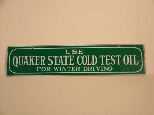 Quaker Cold Test Oil - 2 sided porcelain sign. 26" x 6", Ex. cond.