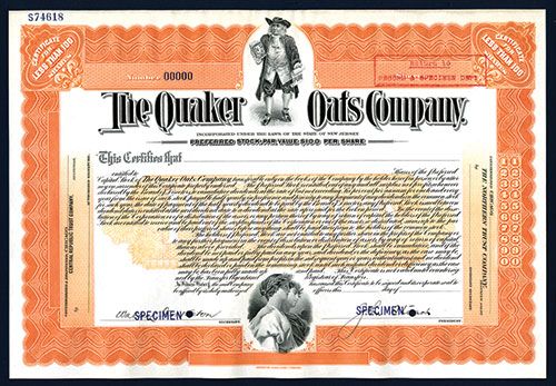 New Jersey, ND, Specimen Stock, <100 Shares, Black on orange border and underprint, Quaker holding box of oats top center with “reaper vignette “ bottom cente, Blue SPECIMEN overprints and POC's, VF-XF condition, ABNC.