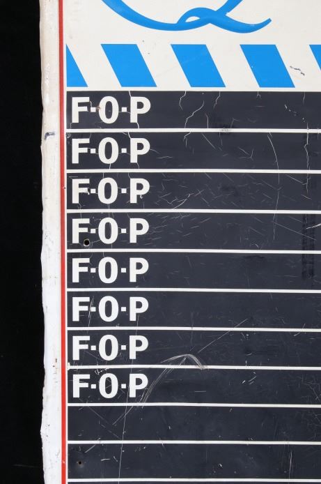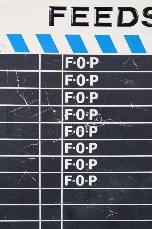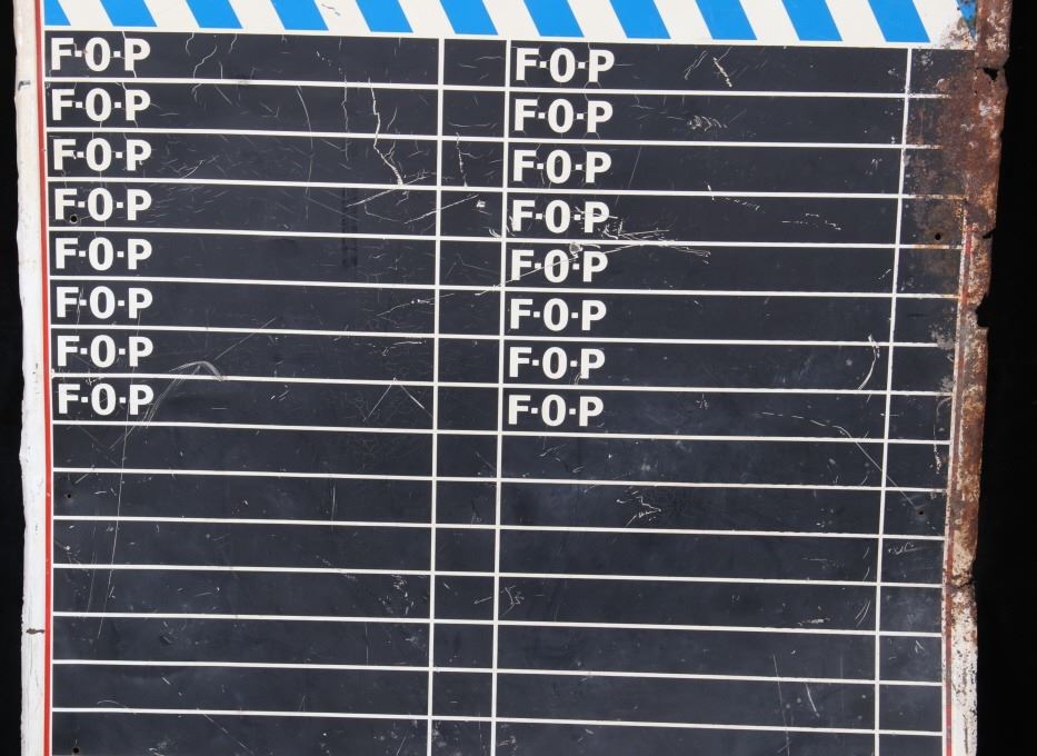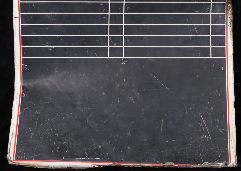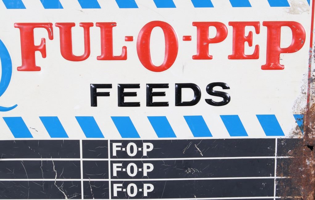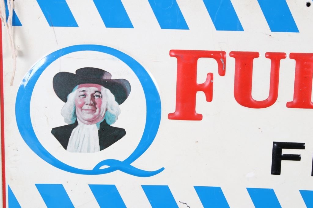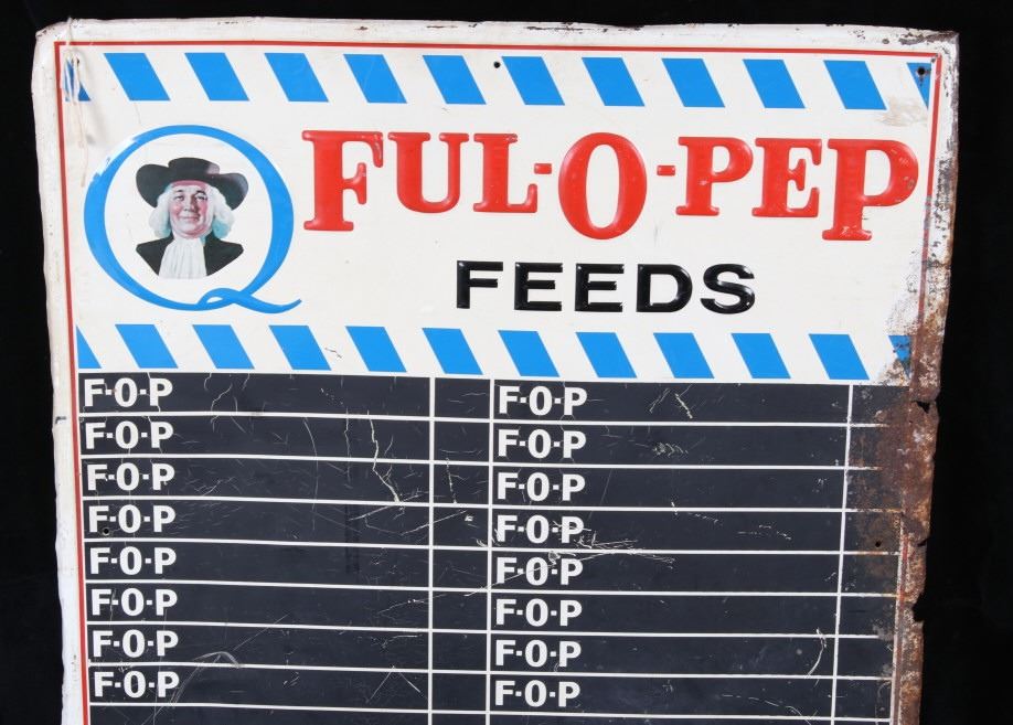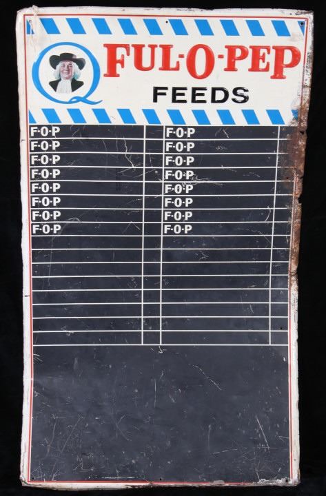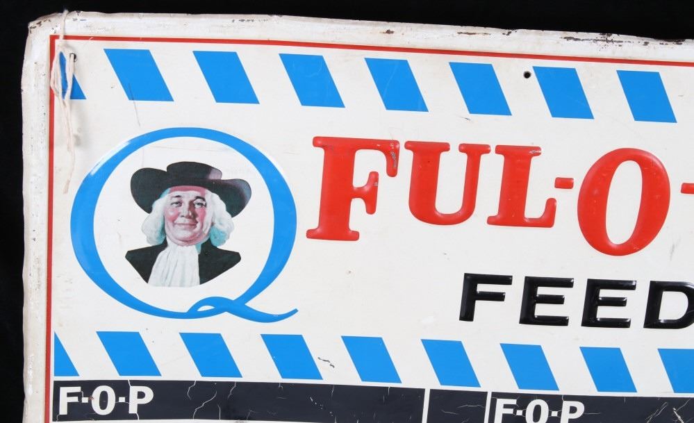 Offered in this lot we have a original Quaker oats Ful-O-Pep Feeds metal advertising sign originating from the 1960's. The sign features a white section on the top with red, blue, and black lettering reading "Q Ful-O-Pep Feeds" with the quaker portrait in the Q. The lower 75% of the sign shows black rows with white lettering "F-O-P" with room to add sizes and pricing along with blank spaces to add other inventory. The piece shows a white and red border with wall attachment points. The sign shows good condition for its age with some paint chipping and rusting across the sides. The sign measures 31 1/2" wide by 55" tall.