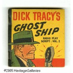 <B>Quaker Premium Radio Play Script - Dick Tracy's Ghost Ship (Whitman, 1939) Condition: VF/NM.</B></I> The second of two radio script booklets, this Quaker premium radio script has 64 pages, soft covers, and measures approximately 3.75" x 3.75". The Dick Tracy mystery story in this book was taken directly from an actual Dick Tracy radio show broadcast by NBC. The overall format is similar to a Big Little Book, featuring text and selected full-page single panel illustrations. <I>From the Collection of Larry Doucet</B></I>.