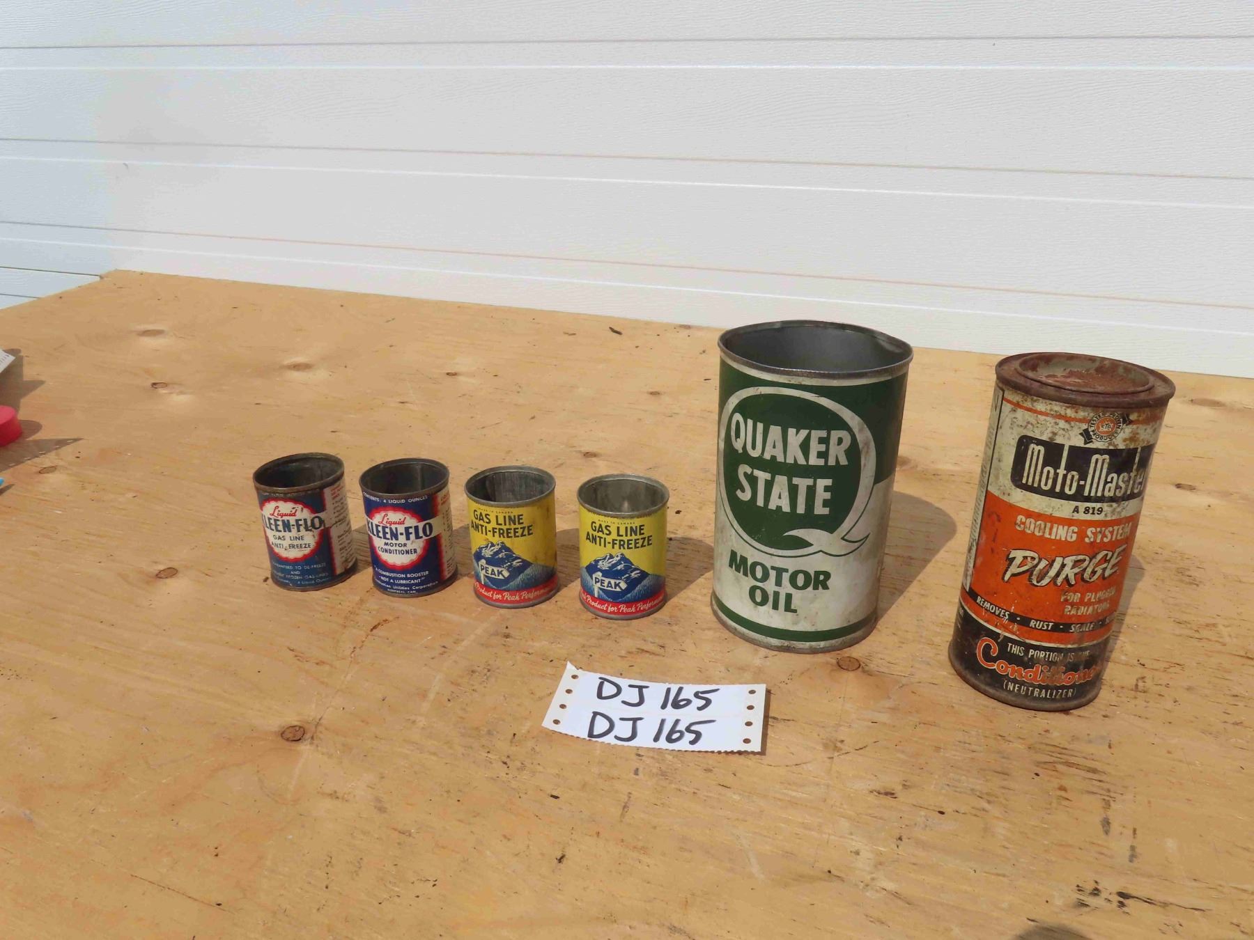 Quaker State 1 Quart Oil Tin, 2 Kleen Flo and 2 Peak Gas Line Anti Freeze Tins, Moto Master Cooling System Purge Tin