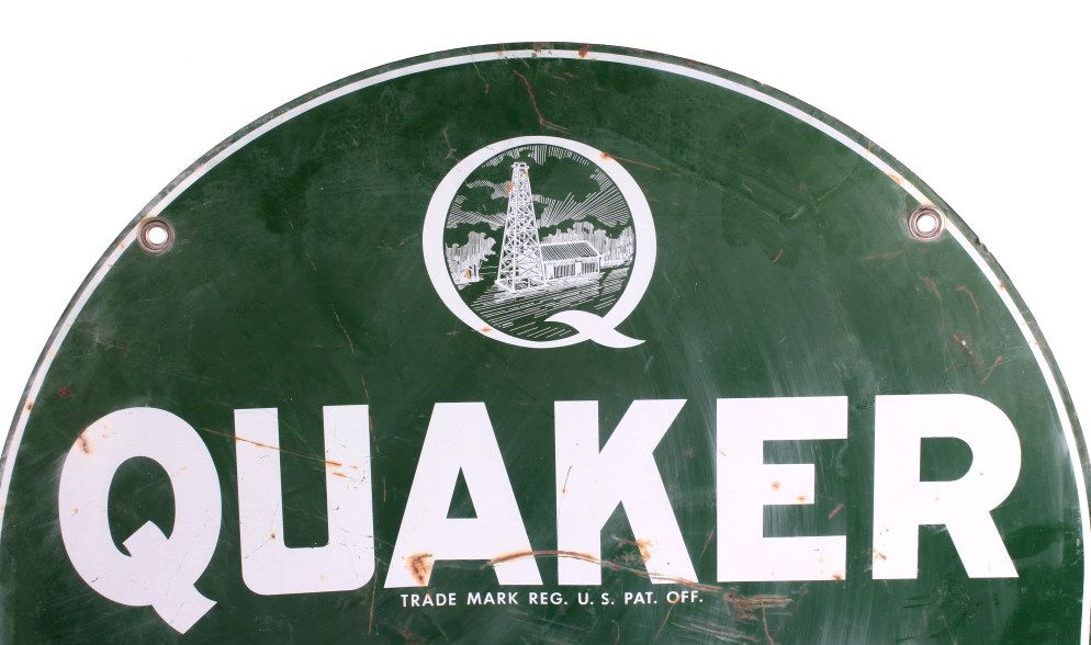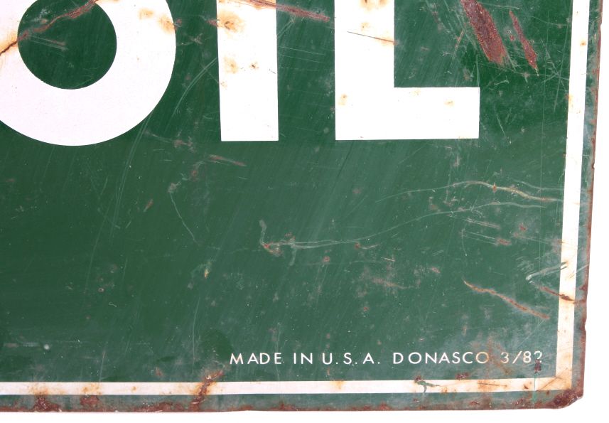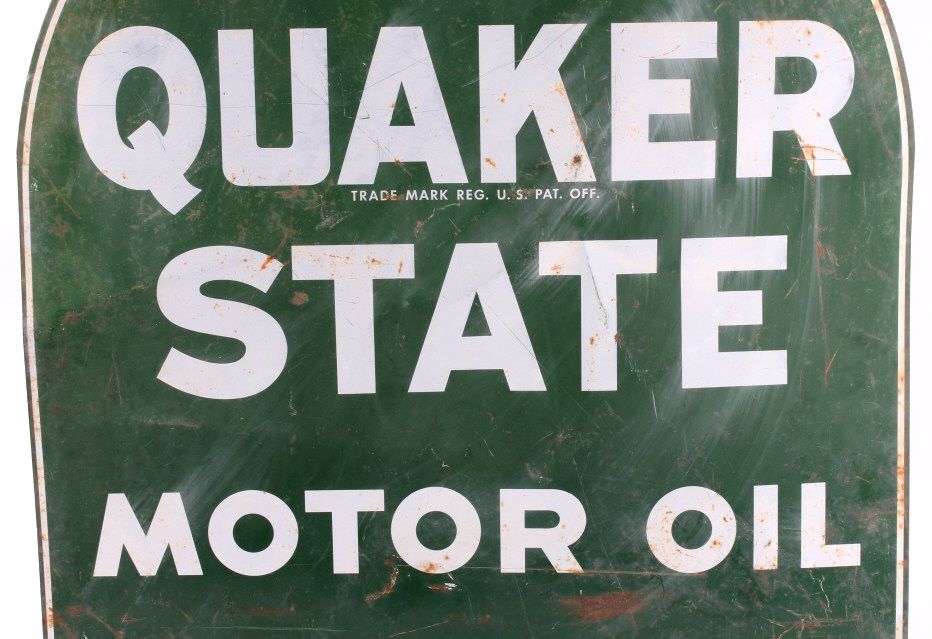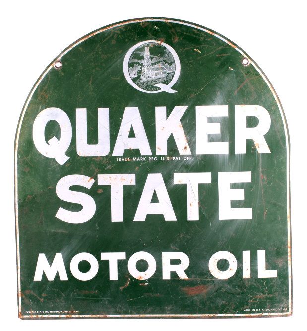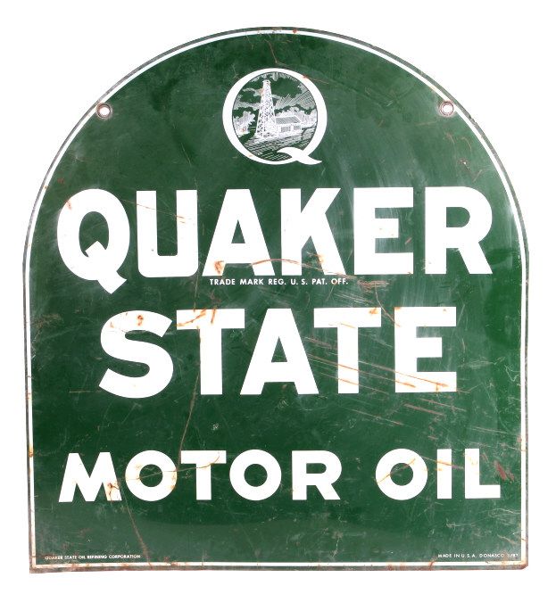 This is a double sided Quaker State Motor Oil sign. This is an original advertising sign. The sign is dated "3/82". Both sides are in good condition. The sign is slightly bent and shows some rust. The Quaker State Motor Oil sign is 26.5" x 28.75".