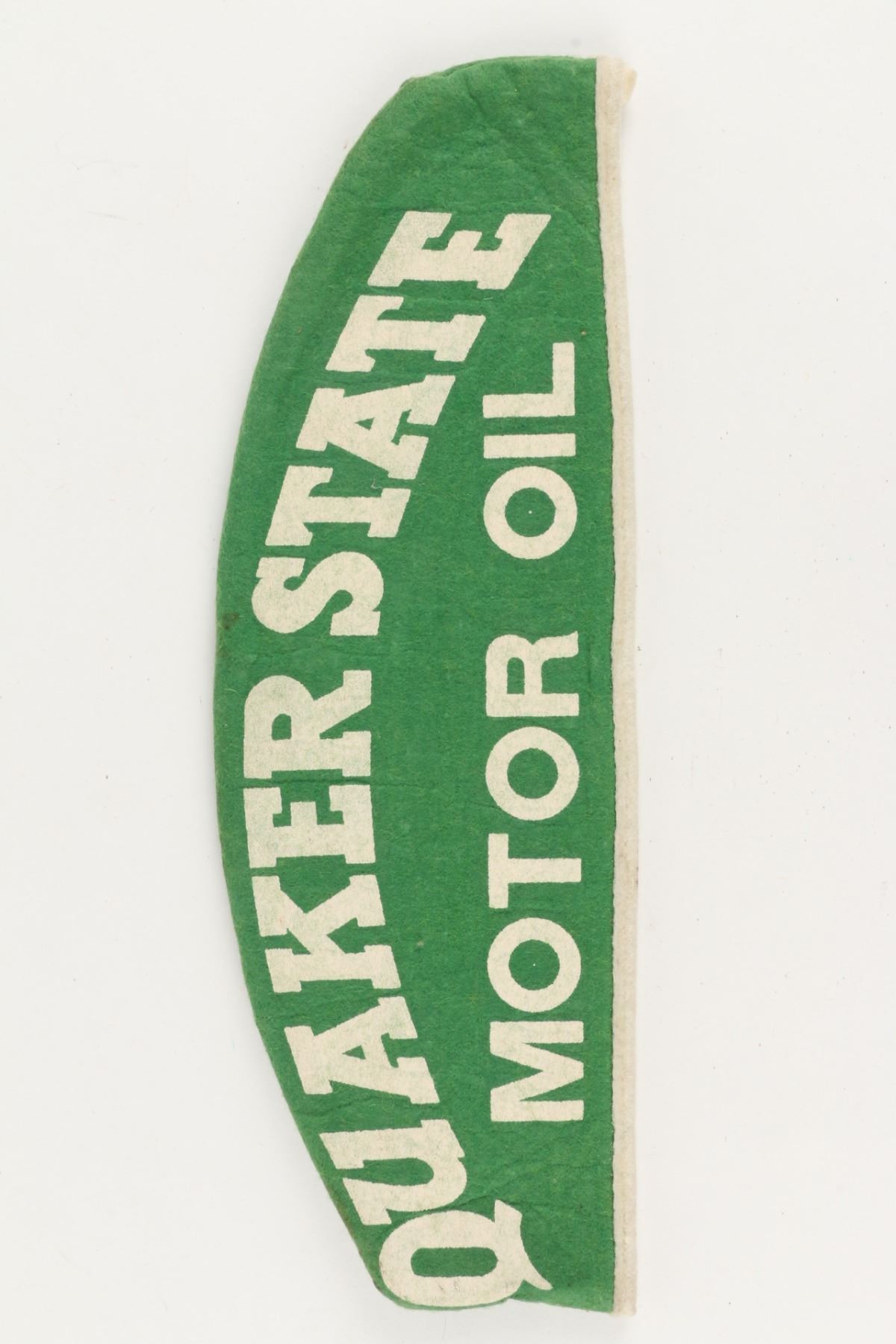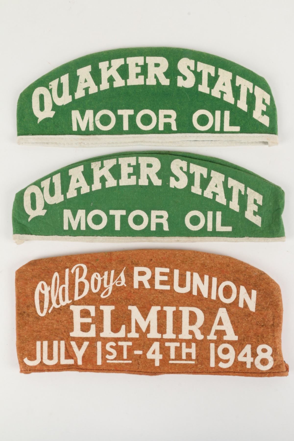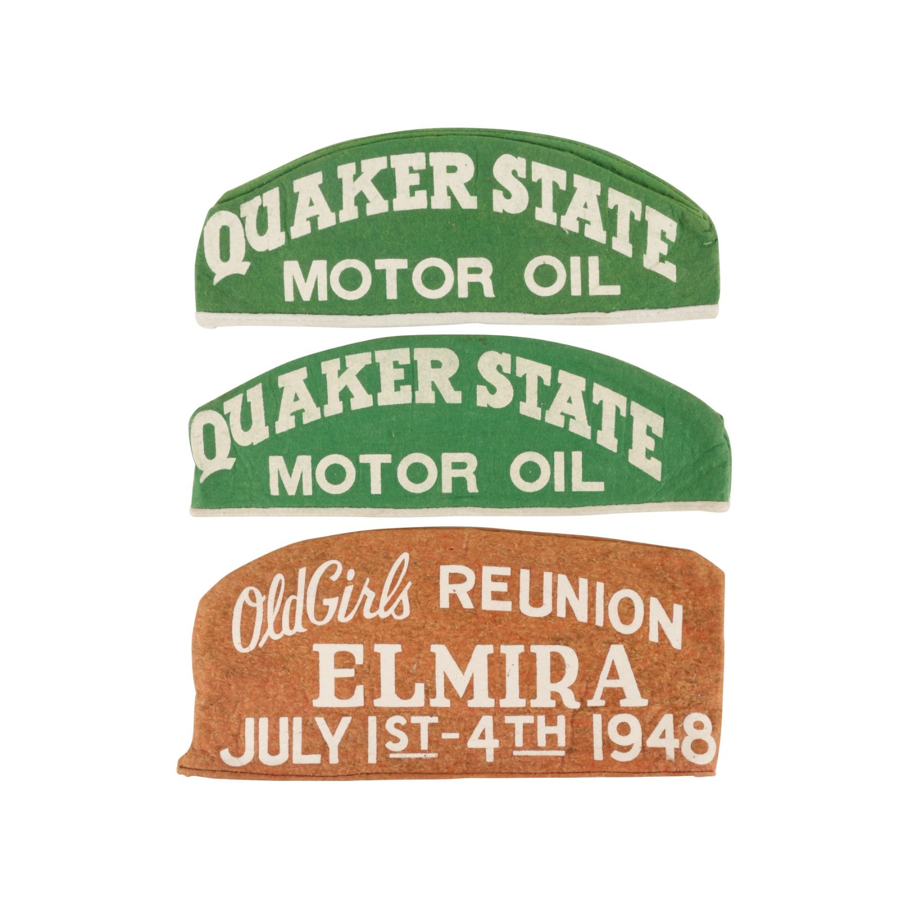 Three (3) pieces. Two (2) Quaker State Motor Oil and one (1) Old Girl's Reunion, Elmira, Ontario. 11.5" x 5.5; 11" x 4". Minor fading. $50-100.