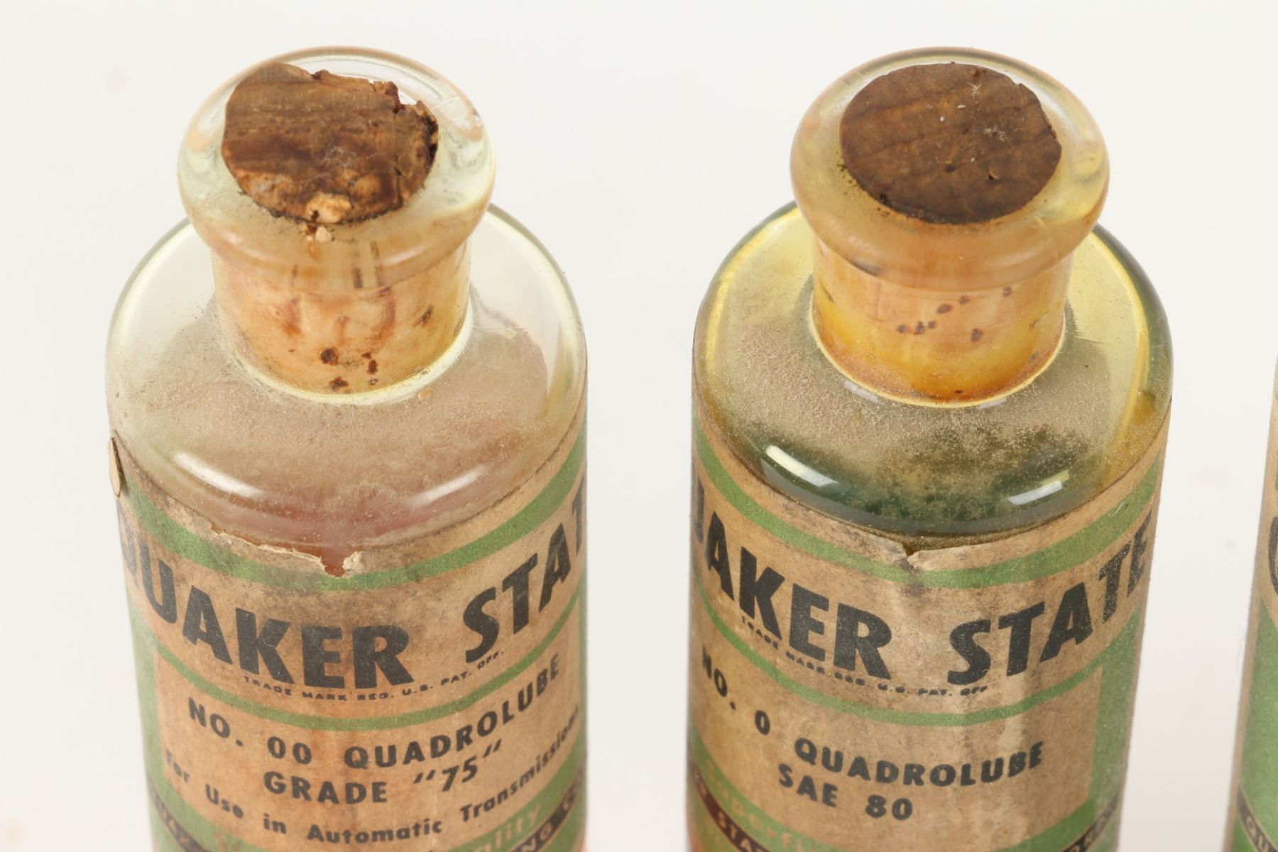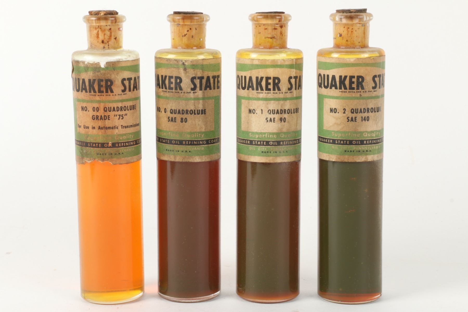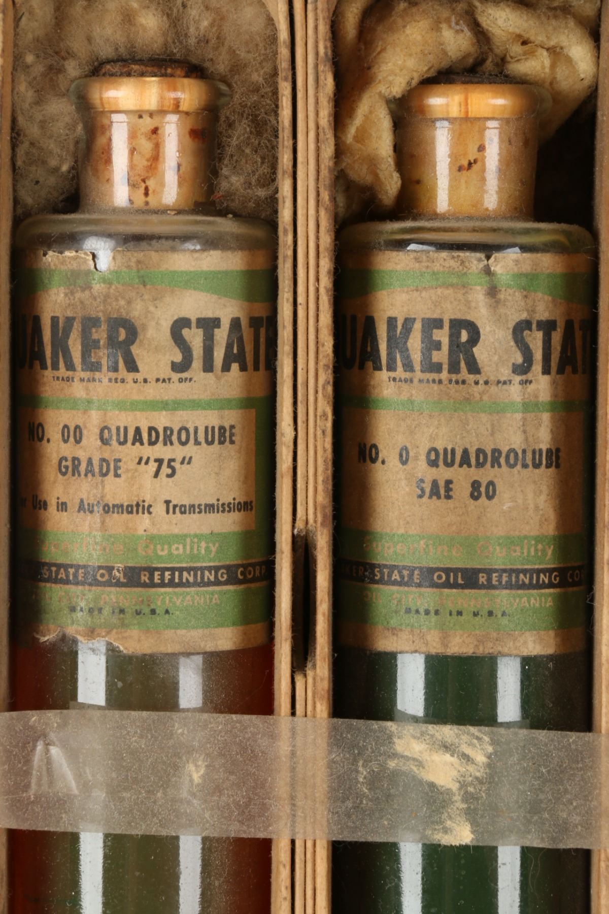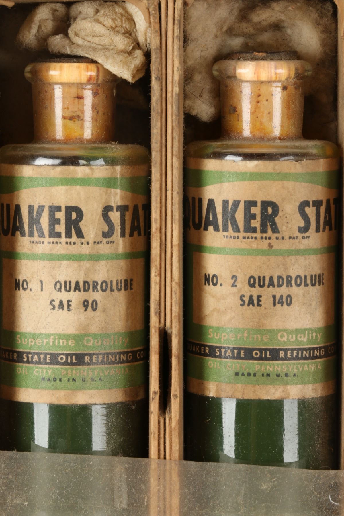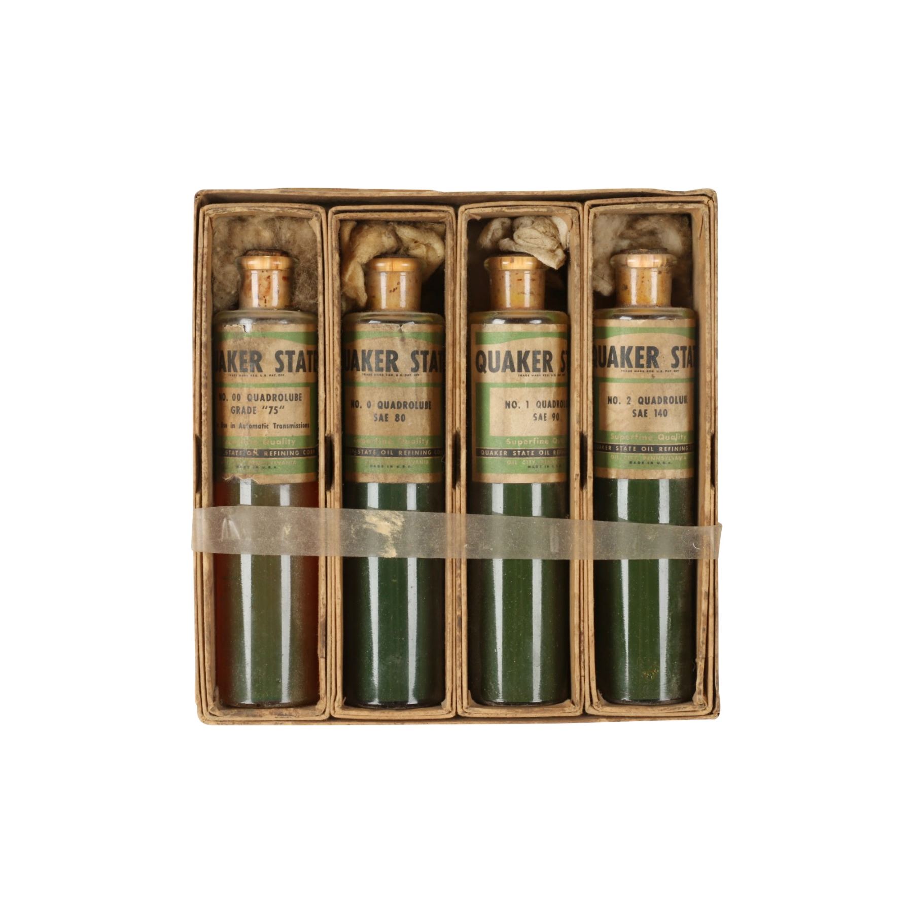 Circa 1950. Includes four labelled sample bottles in their original package. Each contains a different grade of oil. Originally sent to dealers and service stations as product samples. 7.5" x 7.5" x 1.5". $100-200.