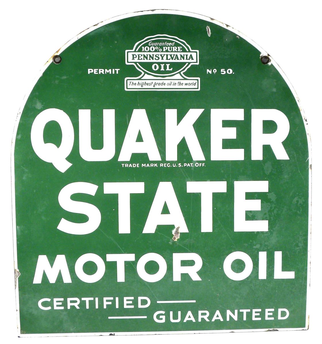 Quaker State Porcelain Motor Oil Sign, two sided. Some small chips on both sides otherwise very good condition. 27 X 29 1/2 inches.