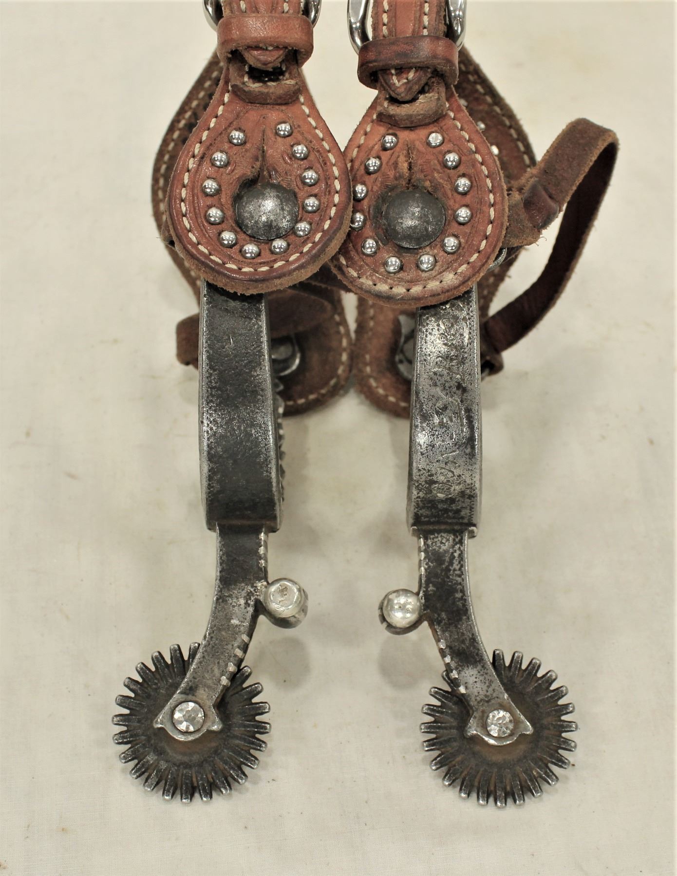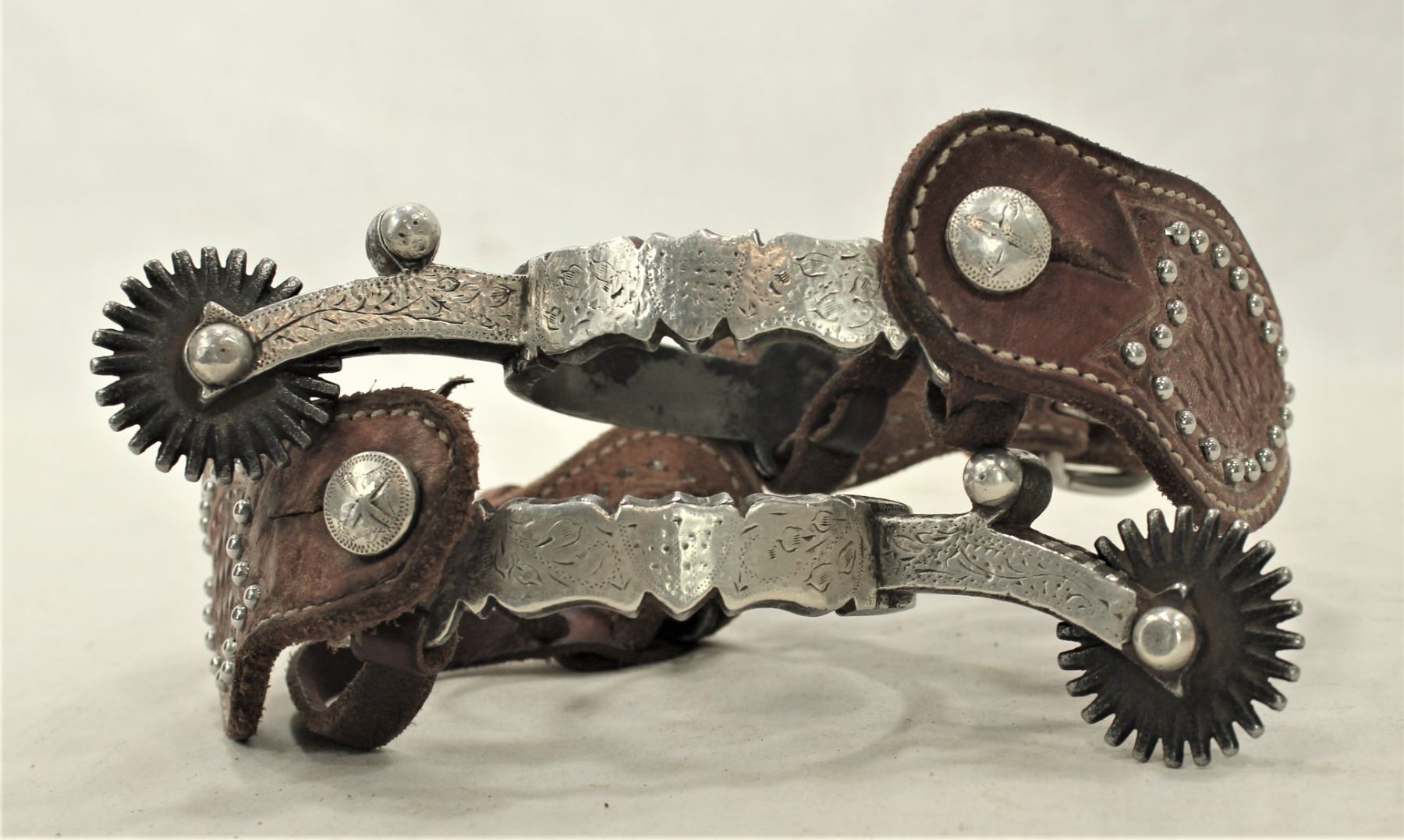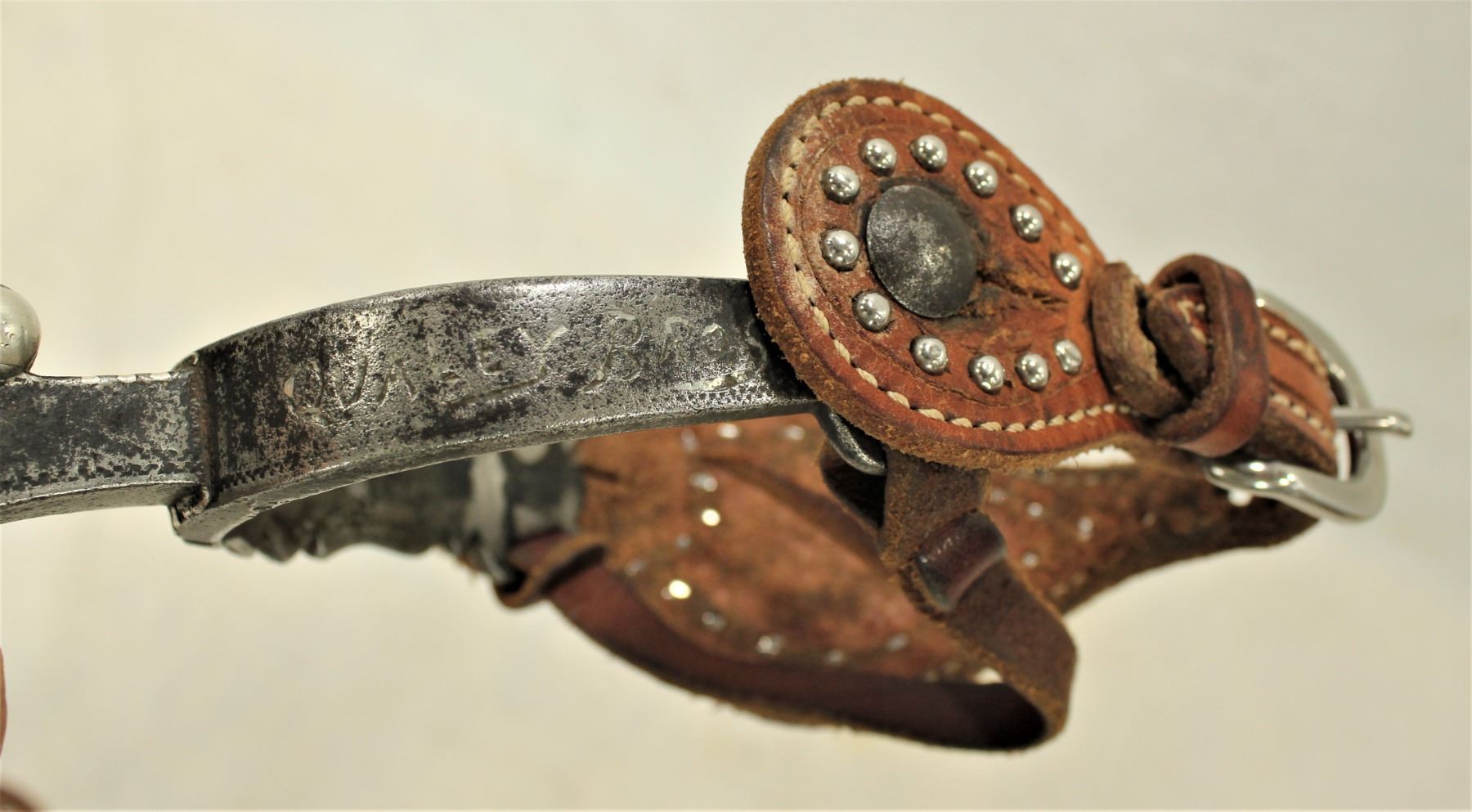 Highly sought after men's medium size single mounted spurs done in a shield pattern with scalloped heelbands, 24 point rowels, showing much cowboy character and good maker's mark, script "Qualey Bro's", made by Tom Qualey between 1920 and 1925..