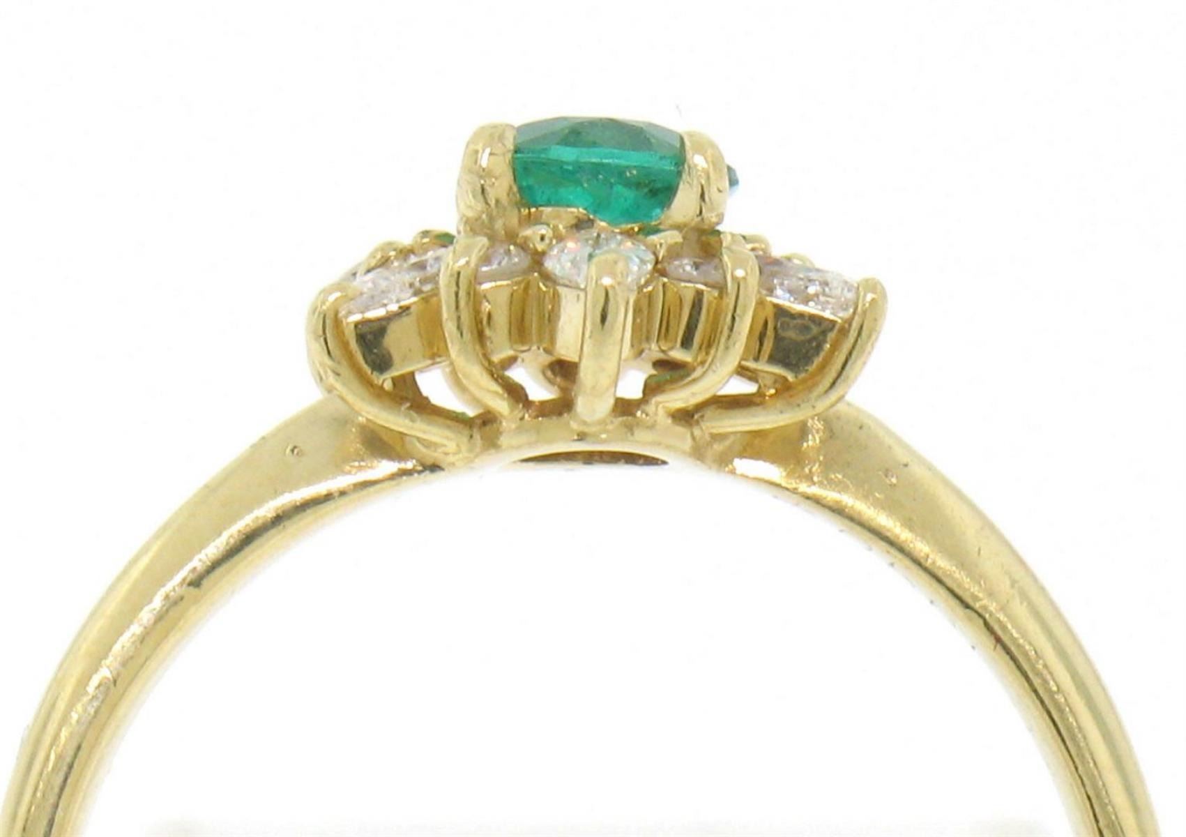 A solid 18k yellow gold cluster ring featuring a round brilliant cut natural emerald (4.36mm; 0.40ct) prong set at its center surrounded by a halo of 6 pear cut and 4 round brilliant cut diamonds (G - VS1; 0.56ctw). The ring is size 6.0, weighs a total of 2.7 grams, and measures 8.7mm wide.