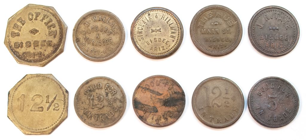 (5) SINCLAIR & HILLMAN // 5¢ Brass, J.R. TATE // 5¢ Brass, THE OFFICE // 12½ Octagonal Brass, THE HUB // 12½¢ Brass, E.B. WALLACE // 12½¢ Brass