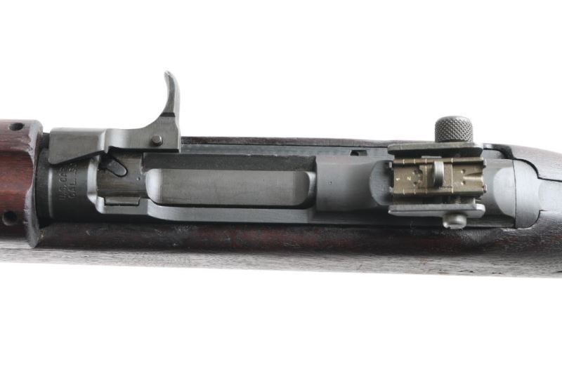 SN: 4763660 U.S. military semiautomatic rifle manufactured circa late 1943 to early 1944. Features parkerized finish, walnut stock & handguard, protected blade front sight, sliding ramp peep rear sight , 18" barrel, push button manual safety, round front sling swivel, bayonet lug, sling slot in butt, Flat top bolt, two rivet handguard."Saginaw General motors barrel, no date. Front sight marked "EU" for Underwood. Type III magazine catch marked "M" for modified. Crossed Cannon cartouche on right buttstock. R Left stock stamped "A A W', Augusta Arsenal with "W" Inspectors mark. (Re-build) Two "P" proof marks on grip. Bore is very good/bright. Retains 90% finish, colors and textures consistent with factory finish, minor losses on edges and where moving parts rub, some minor scratches. Wood is very good condition, with scratches/dings. There is 5 cuts below the sling slot on the left buttstock. No importer marks observed No magazine. Condition is NRA Very Good. C&R firearm.