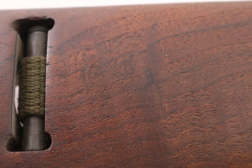 SN: 1918860 US military semiautomatic rifle manufactured circa mid-1944. Features parkerized finish, walnut stock & handguard, protected blade front sight marked "EU", peep rear sight with sliding elevator, 18" barrel, rotating "flipper" manual safety, front sling swivel, sling slot in butt, accepts detachable magazine, later type barrel band with bayonet lug. Flat top bolt, two rivet handguard. Bore appears excellent/bright. Retains 85% re-finish, colors and textures consistent with post WWII rework, dark flat gray, shows loss on edges and where moving parts rub. Wood is very good condition with minor dents & dings. Markings include "UNDERWOOD 7-44 (flaming bomb)" on barrel, large "P" stamped on grip bottom. Deep "AAG" on left wrist, next to faint "AHO". No importer marks observed. No magazine. Web sling & oiler attached. Condition is NRA Very Good+ (arsenal rework) *** C&R Firearm ***