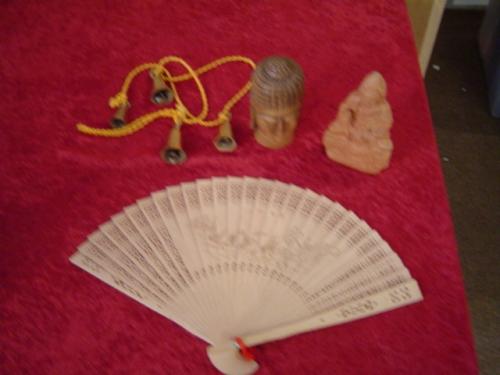Hand Carved 6" Sandalwood Seated Quan Yin, 5" Sandalwood Buddha Head & 9" Carved Sandalwood Fan, 32" String with 4 brass bells