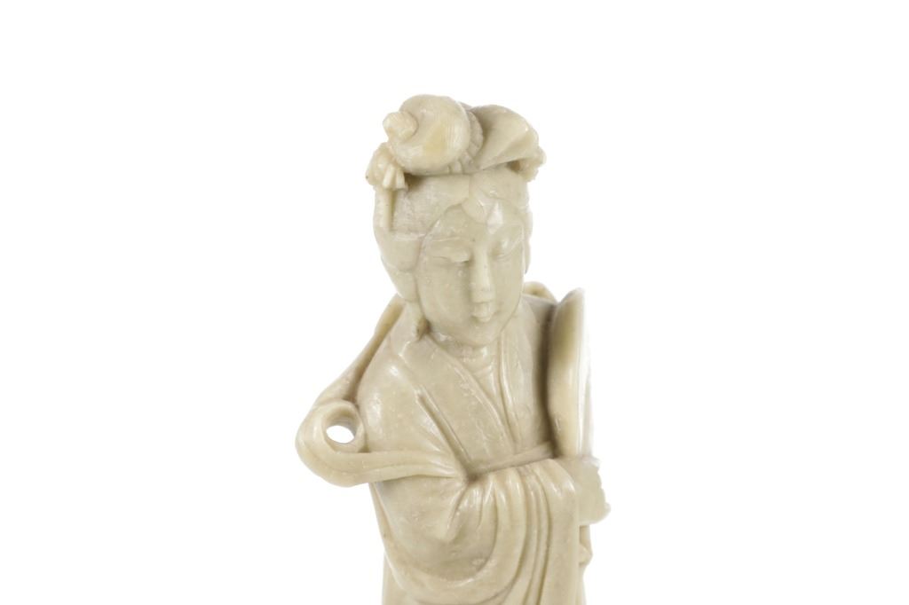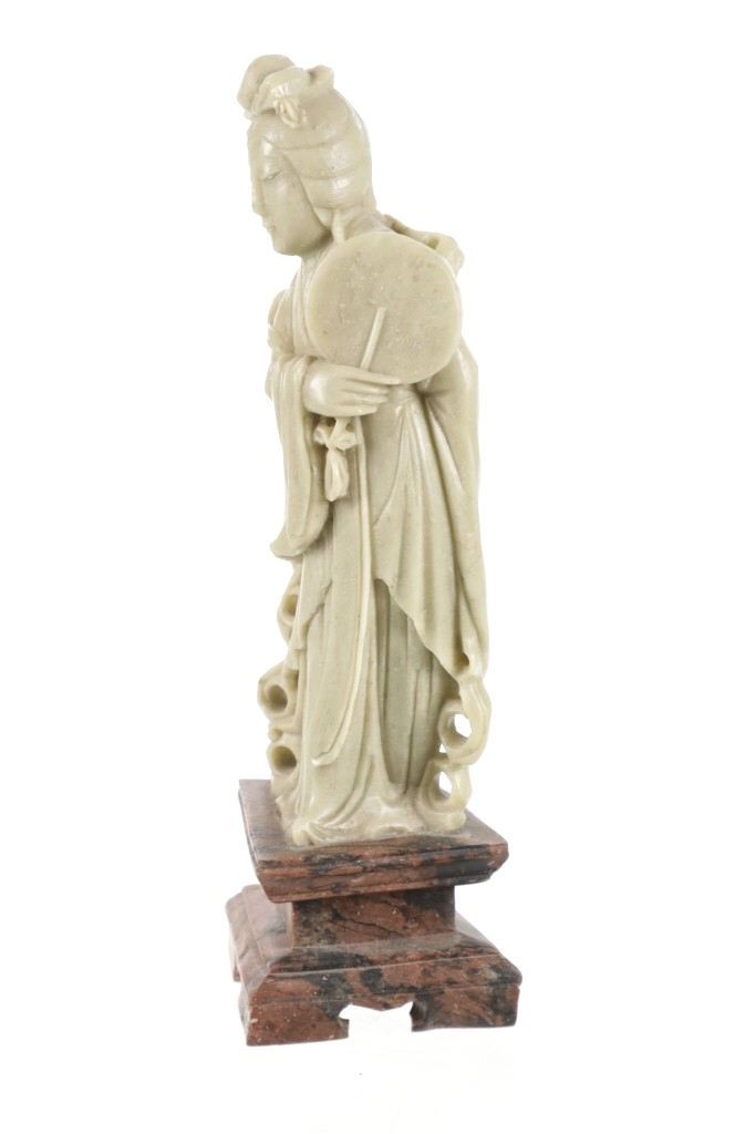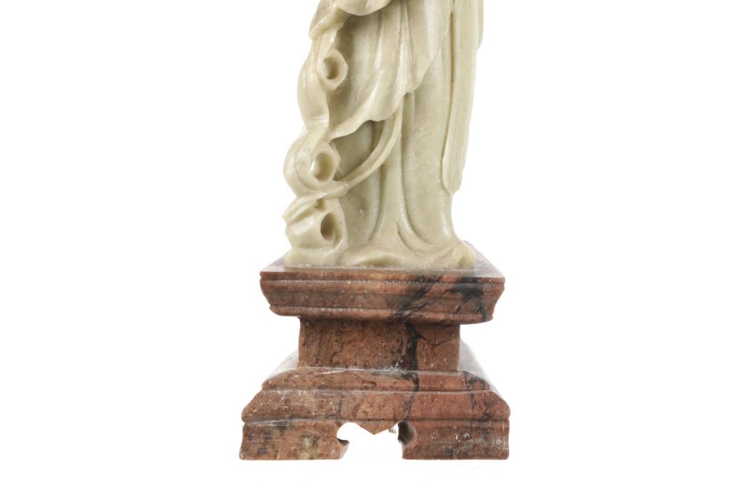 Featured in this lot is this Quan Yin (Guanyin) carved soapstone sculpture with a marble base, done in the 20th century. Quan Yin, also known as Guanyin or Kuan Yin, is a revered figure in East Asian Buddhism, particularly in China. She is the Bodhisattva of compassion and mercy, often depicted as a female deity. Quan Yin is known for hearing the cries of the world and offering solace and assistance to those in need. This sculpture shows Quan Yin slightly bending over as she holds a large fan in her hand. She is draped in traditional clothing and has her hair in a long pony tail. The marble base shows colors of brown, black and speckles of beige. No makers marks is present. It shows good condition overall with slight wear present from its use, but no major signs of damage is noted. It measures 2 7/8" L x 2 7/8" W x 10" H and weighs 2 pounds and 6 ounces.
