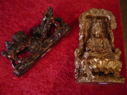 9.5" X 5.5" Antiqued Gold Pourstone Quan Yin with Vase of Compassion in Shrine with Good Luck Symbols, 9" X 4.5" Antiqued Bronze Playing Fu Dogs