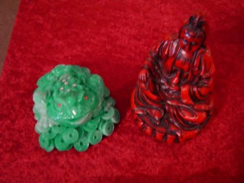 3" X 4" Green Jade Pourstone Money Toad with Coin & Jewels, 6" seated Red Pourstone Quan Yin on Lotus with Vase of Compassion