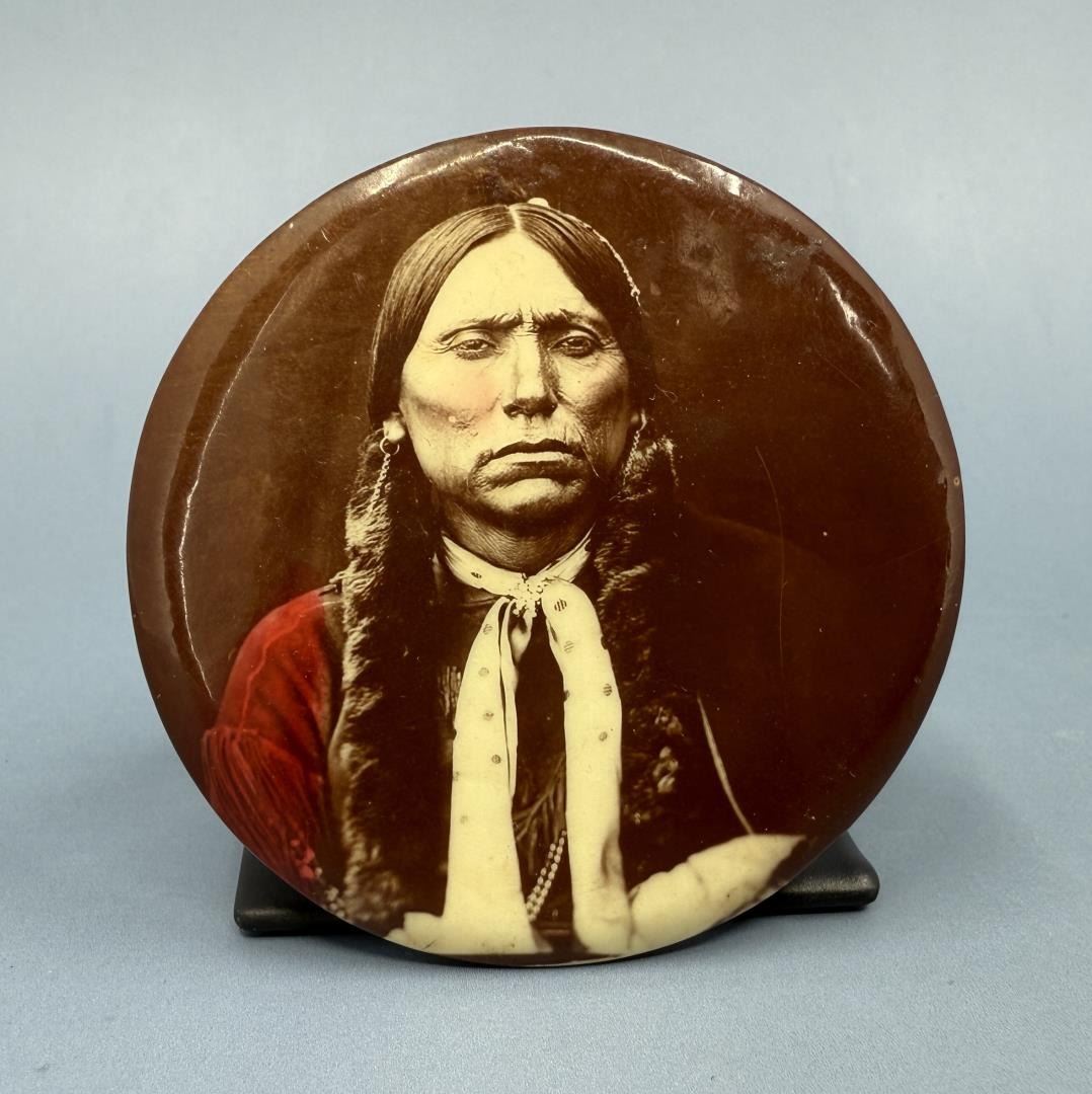 2 1/8" in diameter. Quanah Parker (1845 – February 23, 1911) was a war leader of the Kwahadi ("Antelope") band of the Comanche Nation. He was likely born into the Nokoni ("Wanderers") band of Tabby-nocca and grew up among the Kwahadis, the son of Kwahadi Comanche chief Peta Nocona and Cynthia Ann Parker, an Anglo-American who had been abducted as an eight-year-old child during the Fort Parker massacre in 1836 and assimilated into the Nokoni tribe. Following the apprehension of several Kiowa chiefs in 1871, Quanah Parker emerged as a dominant figure in the Red River War, clashing repeatedly with Colonel Ranald S. Mackenzie. With European-Americans hunting American bison, the Comanches' primary sustenance, into near extinction, Quanah Parker eventually surrendered and peaceably led the Kwahadi to the reservation at Fort Sill, Oklahoma. Quanah Parker was never elected chief by his people but was appointed by the federal government as principal chief of the entire Comanche Nation.
