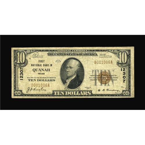 <B>Quanah, TX</B></I> - $10 1929 Ty. 1 <B>First NB</B></I> Ch. # 12307<BR>This small NW Texas community was named in honor of legendary Comanche chief Quanah Parker, and was home to no fewer than six banks, four of which are as yet unreported and one which is represented by two large notes. This is the sole bank which lasted long enough to issue series 1929 examples, with this specimen one of just seven reported in the census. <B>Fine.</B></I><BR><I>From The Rolling Plains Collection</B></I><BR><BR><b>Shipping:</b> Coins & Currency (<a target="_blank" href="http://www.heritageauctions.com/common/shipping.php">view shipping information</a>)