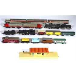Quantity of Hornby 00 gauge and other railway locomotives, wagons and tracks including railside buildings