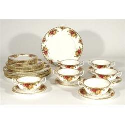 Quantity of Royal Albert Country Rose patterned dinnerware, comprised six soup bowls and saucers, side plates and twelve dinner plates
