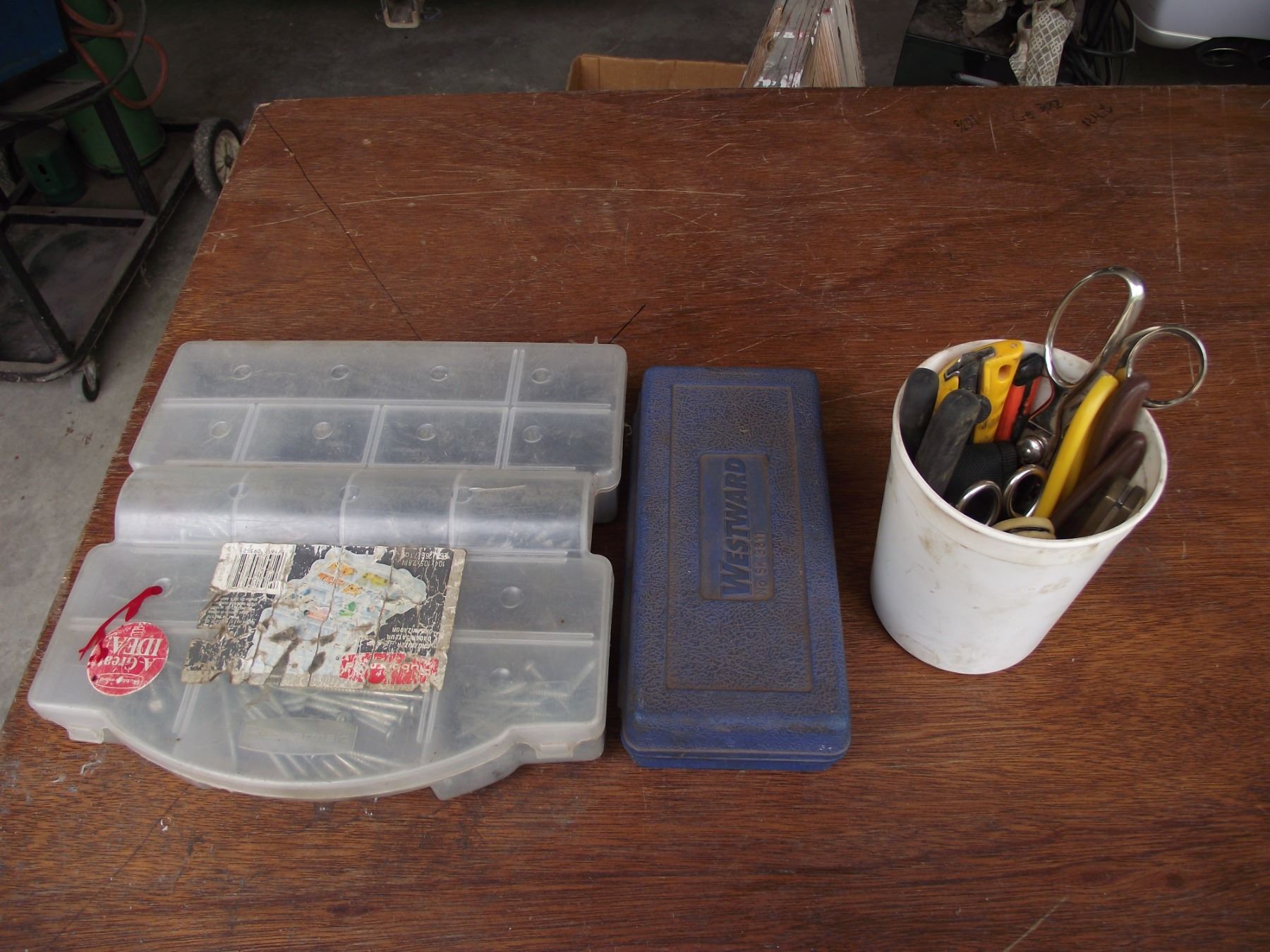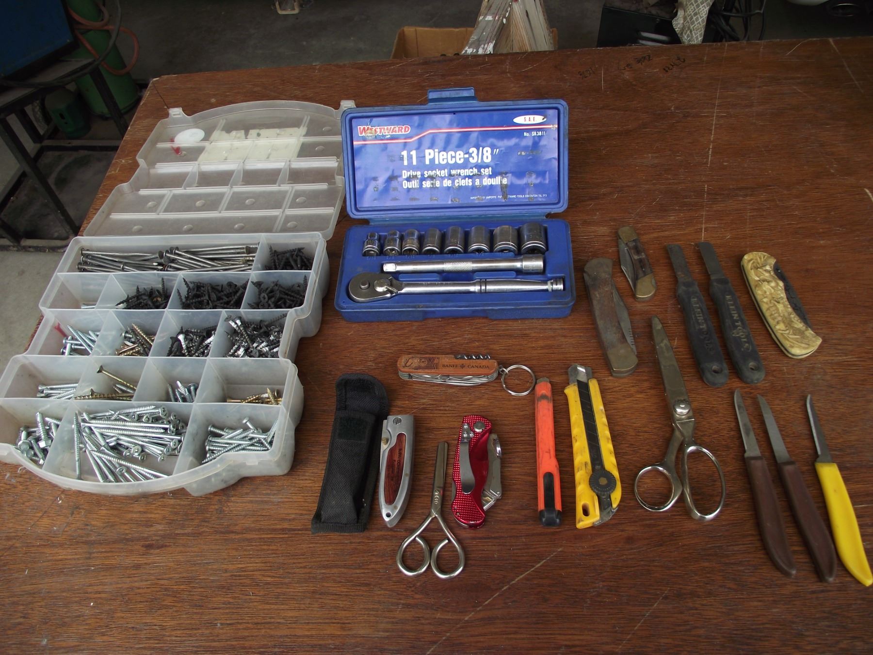 Quantity of screws in case, Westward 11 pc 3/8 socket set, assortment of knives and scissors.