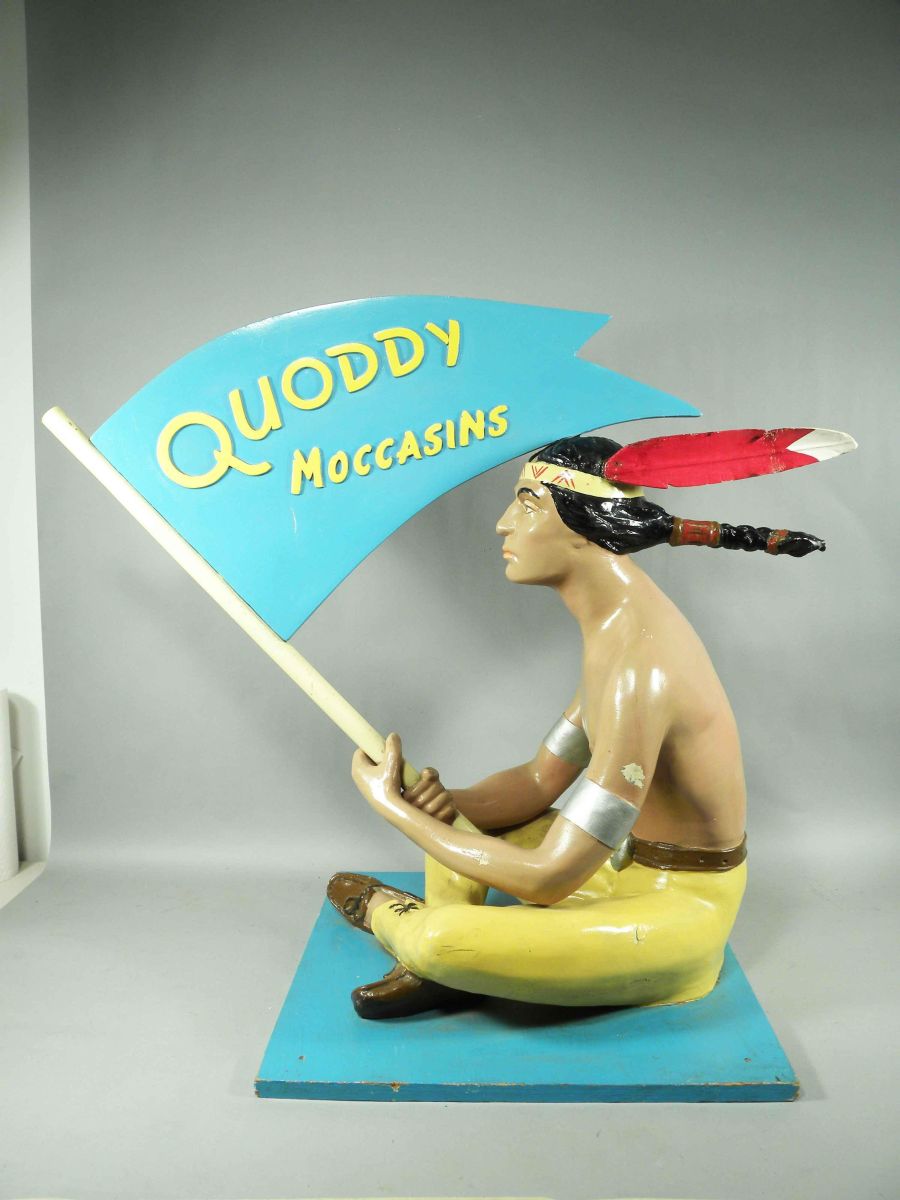 Quaoddy Moccasins Wood Store Display w/native American brave. Paint chipped on left arm otherwise very good condition. 35 X 29 1/2 X 20 inches.