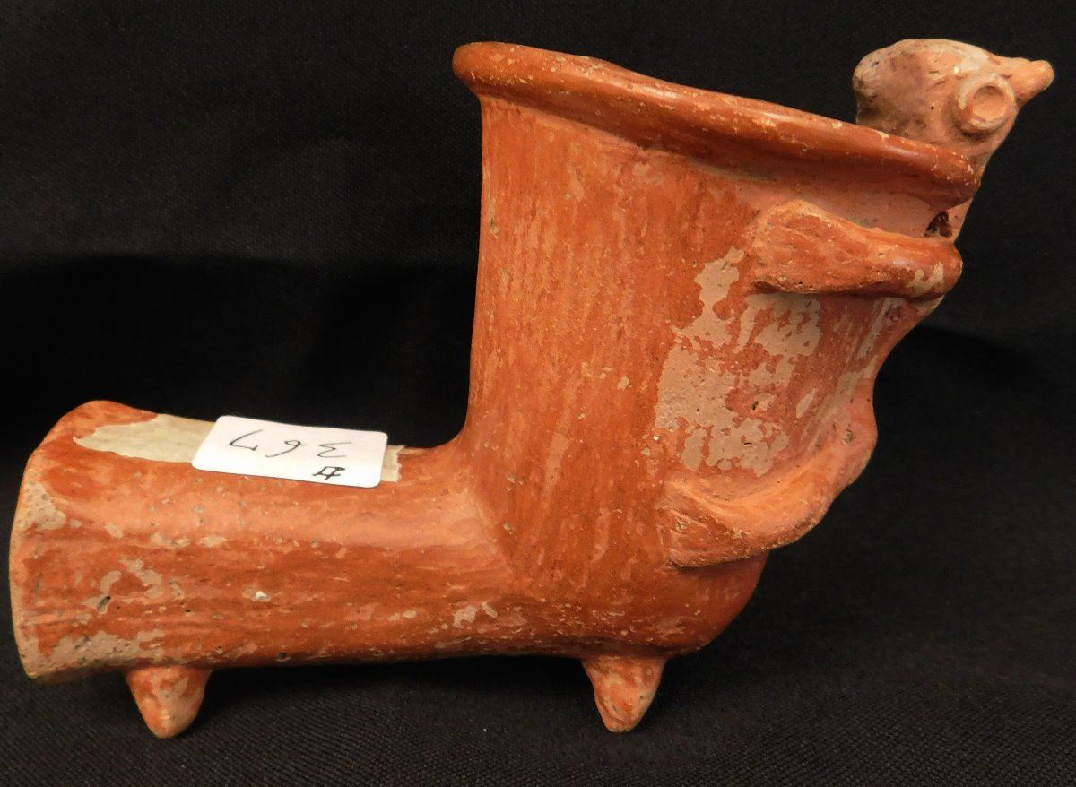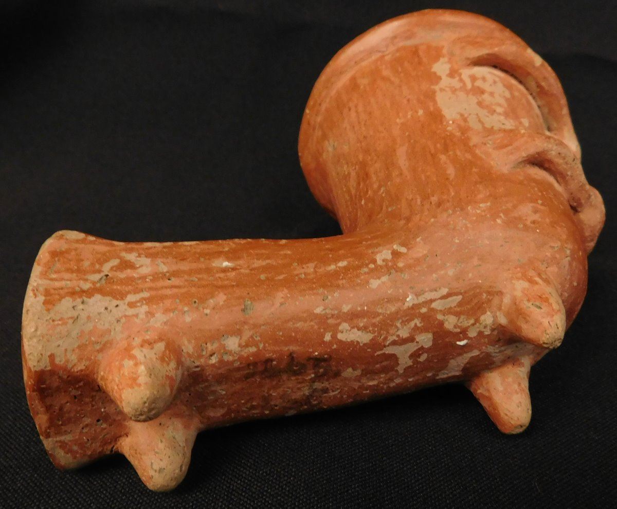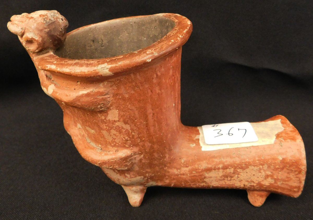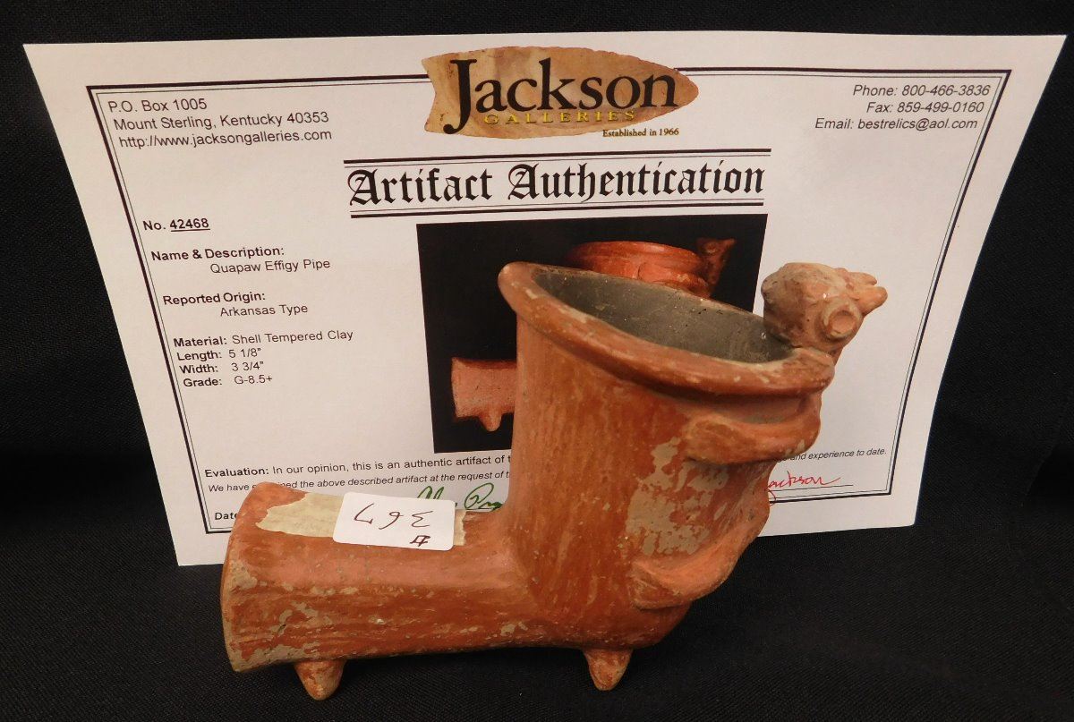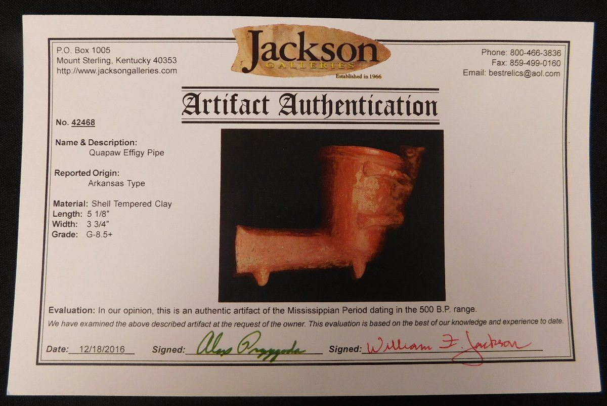 Quapaw Effigy Pipe w/Jackson COA, circa 500 years B.P. Made of shell, tempered clay and paint, the item is 5 1/8" x 3 3/4". Arkansas. Very rare pipe! Condition: Grade 8.5, see images. Shipping: $22.50 w/insurance and signature.