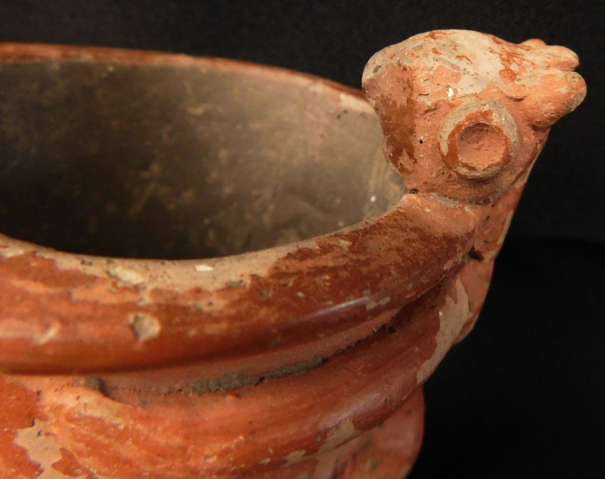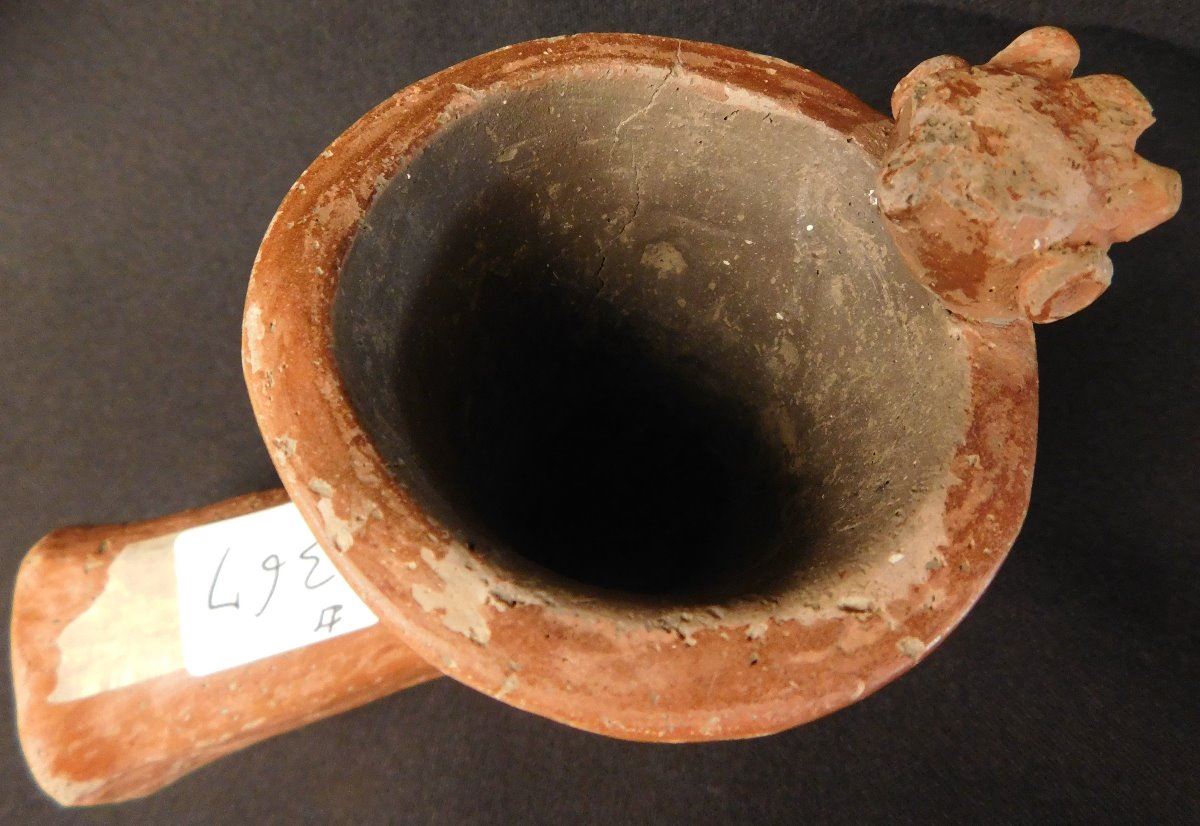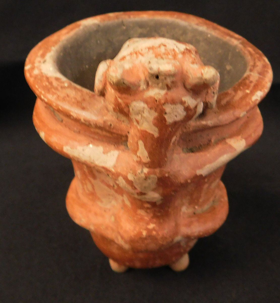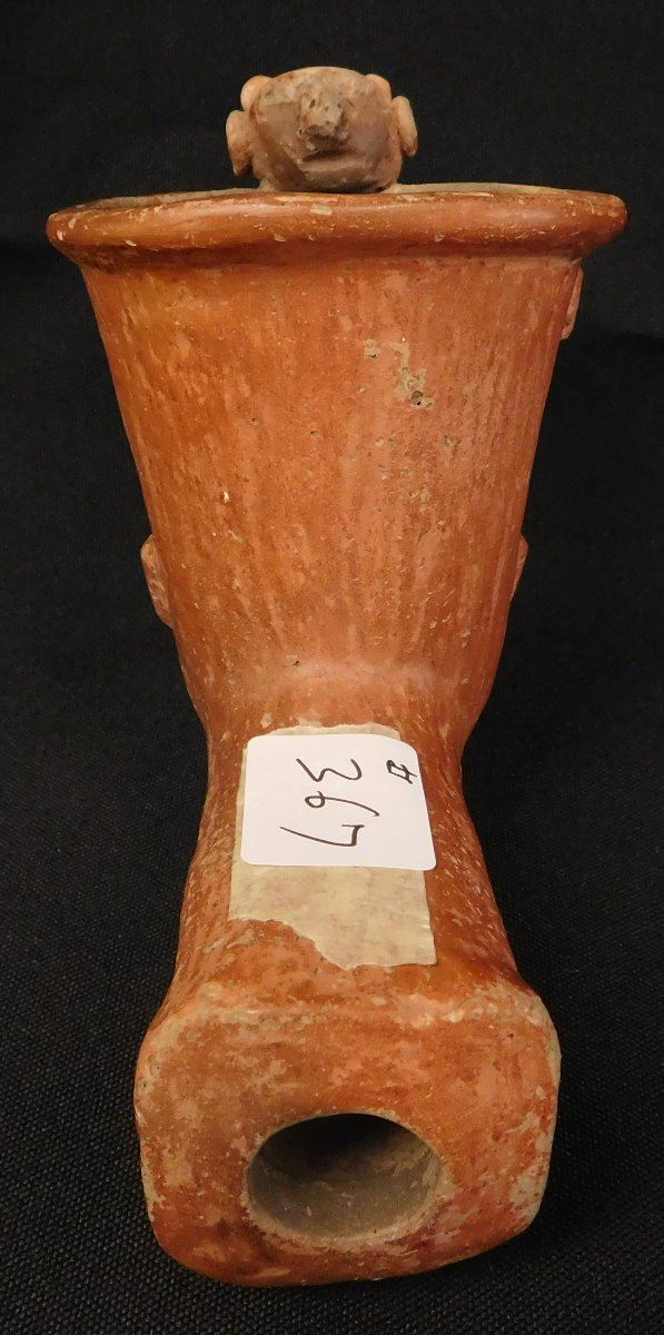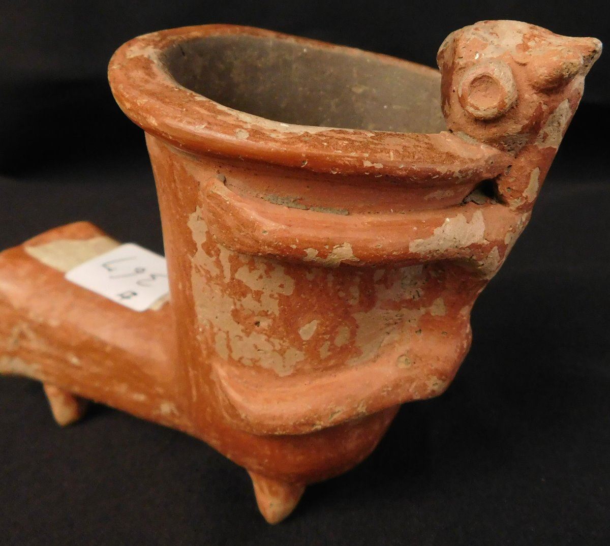 Quapaw Effigy Pipe w/Jackson COA, circa 500 years B.P. Made of shell, tempered clay and paint, the item is 5 1/8" x 3 3/4". Arkansas. Very rare pipe! Condition: Grade 8.5, see images. Shipping: $22.50 w/insurance and signature.