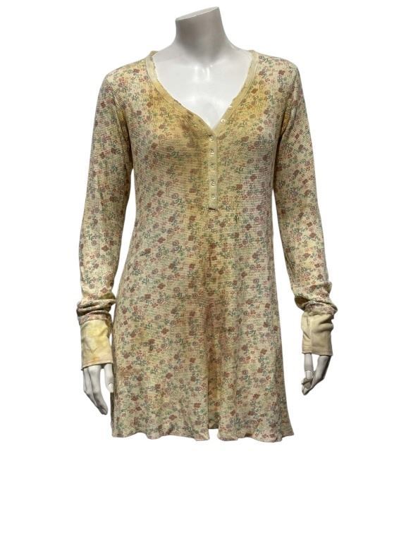 Original distressed sundress worn "Elise Jackson", played by Stacy Chbosky in the John Erick Dowdle directed production of 'Quarantine' (2008), the found-footage horror movie where a television reporter and her cameraman are trapped inside a building quarantined by the CDC, after the outbreak of a mysterious virus which turns humans into bloodthirsty killers.