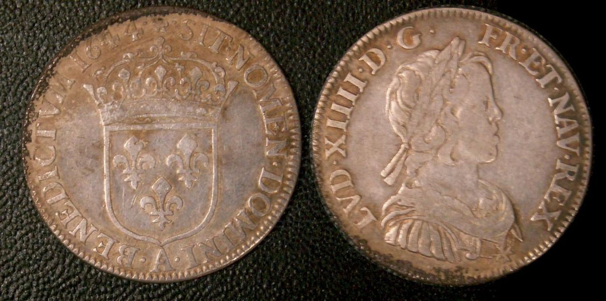 Quart d'écu d'argent a la mèche courte 1644 F-VF, lightly cleaned.