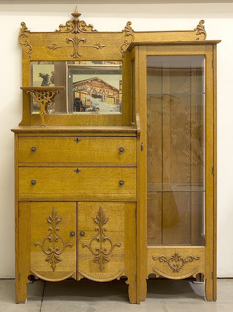 c1900 This beautiful golden oak sideboard features a locking glass display with four glass shelves, two locking drawers, and a beveled mirror. This piece has been professionally refinished, and measures 3`-11.5" wide x 5`-6". The ornate carving above the piece is in excellent condition. Ken & Rosemary Roberts Collection - HKA#64068