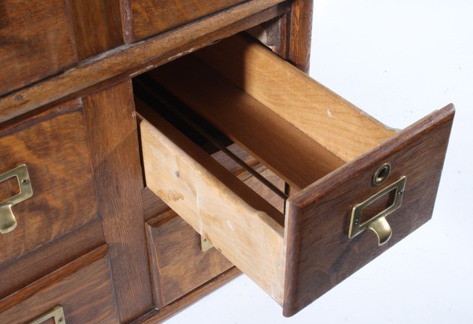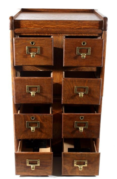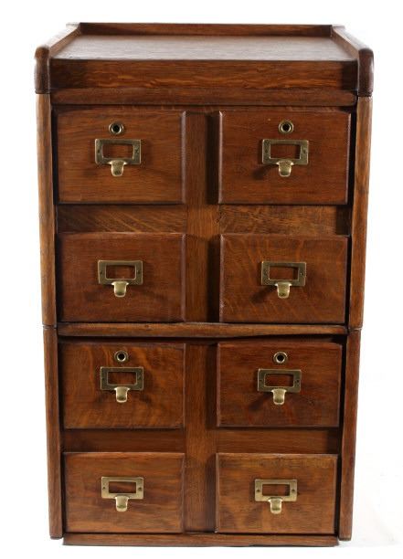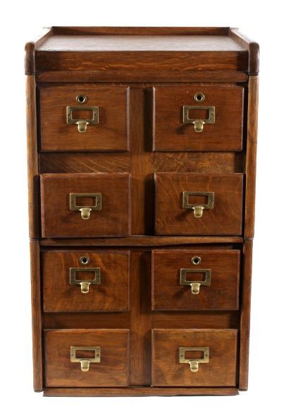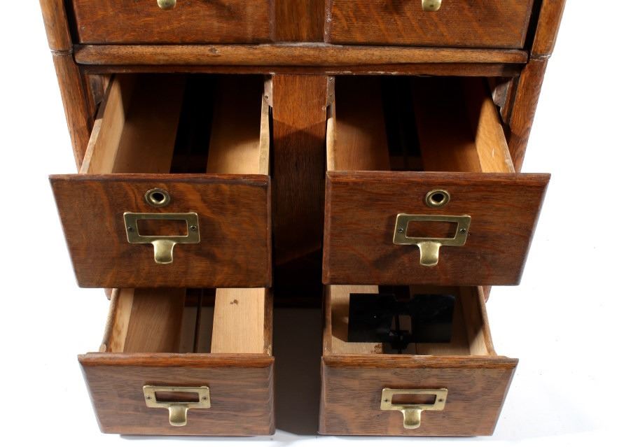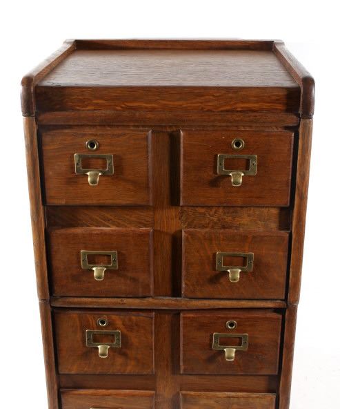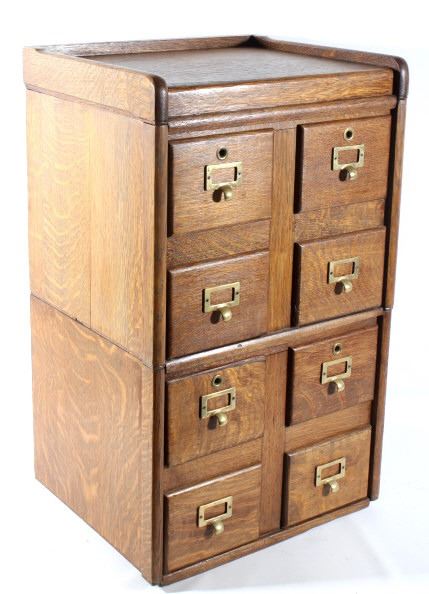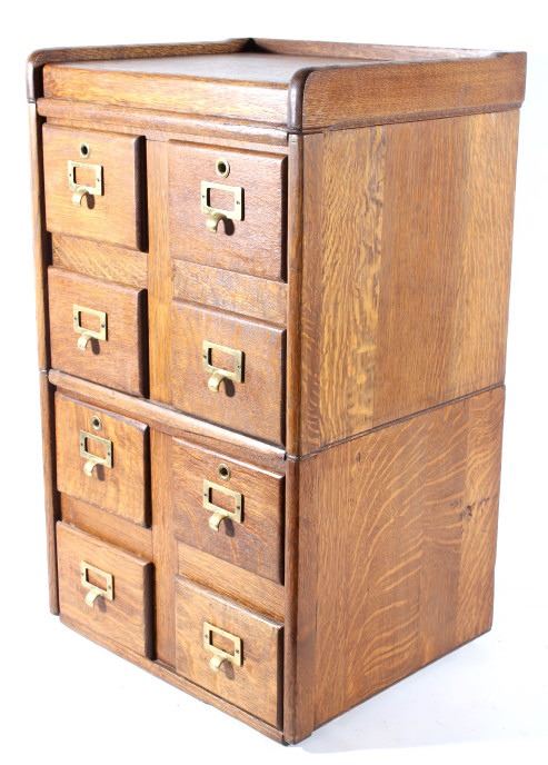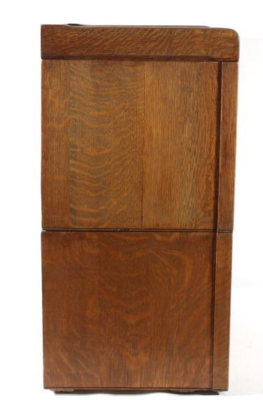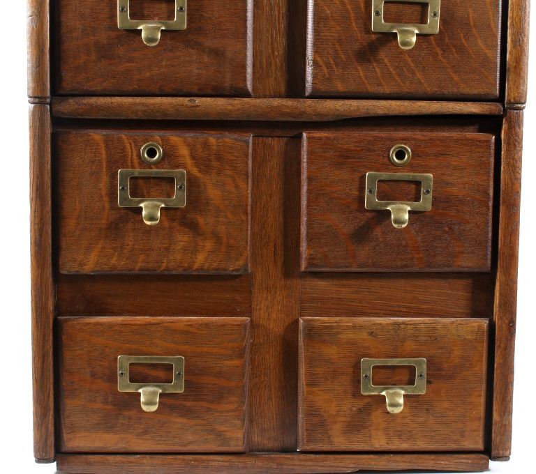 Offered in this lot we have a quarter sawn oak sectional stacking filing cabinet originating from the early 20th century. The cabinet is constructed out of beautiful highly figured quarter sawn oak and shows original brass hardware. The piece splits into three section, bottom, middle, and top. It is designed to function as a index filing cabinet or other smaller files. The cabinet shows good condition overall with some minor wear and the bottom panel on each section shows some damage. The cabinet measures 29 3/4" tall by 18 1/4" wide and 15 1/4" deep.