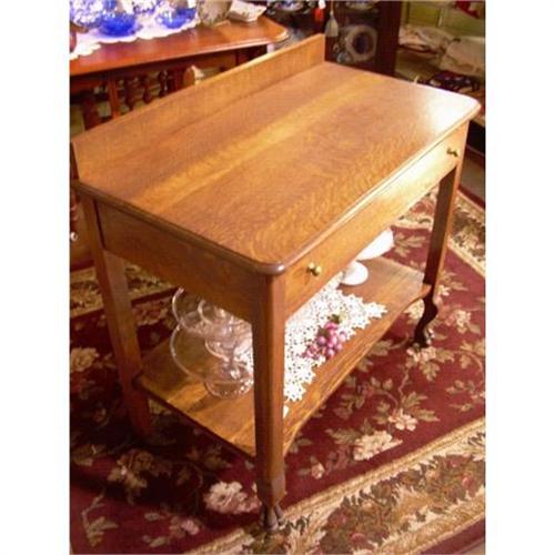 Up for sale is one Quarter Sawn Oak Table or Small Server with clawfeet. It has one drawer and a small back splash. Condition is excellent; the table has been refinished and the finish is in excellent condition. It measures 36" tall and is 35" wide, with a depth of 19.5". If you have any other questions, please email us. Thanks for looking!