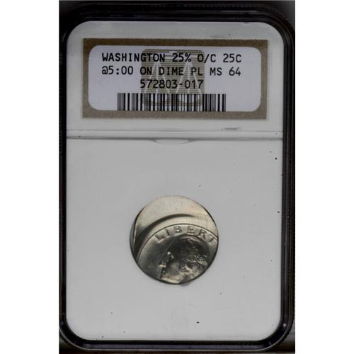 <B>Undated<50C> Washington Quarter--Struck on a Clad Dime Planchet, 25% Off Center at 5 o'clock--MS64 NGC.</B></I> A Type One clad dime blank found its way between pre-statehood Washington quarter dies. Widely struck off center toward 5 o'clock, with the date and any mintmark off the flan. A uniface obverse striking; the reverse is blank. Apparently, the clad dime blank was fed into the dies simultaneously with a second planchet (not included) which blocked the reverse die. <BR><BR><B>Important notice:</B> Heritage usually auctions material at the rate of 200-250 lots per hour. On some occasions eBay Live bid software or the Internet may not be able to keep up with the pace of the auction. We recommend placing a realistic absentee bid now as insurance to avoid disappointment. Occasionally the auctioneer may eliminate or reject an eBay Live bid, and the auctioneer may also reopen a lot after the close of the eBay live bidding (usually because we missed an audience bid), and may reject your bid even if it shows you as the winning bidder. By bidding via eBay Live, you agree that Heritage may award the lot to another bidder at its sole discretion under the circumstances described above or any other reasonable circumstances. Since eBay bids are not shown to us until we open the lot on the floor, we treat those bids just like floor bids. In most cases the floor responds before the eBay bid is presented to us, due to Internet lag time, so for consistency we have made it a policy that floor bids are always considered first over tie eBay live bids. Also please note that all Heritage lots purchased through eBay Live carry a 20% Buyer's Premium. Please make sure you read the Terms and Conditions before you bid. This lot is being auctioned in conjunction with a live floor auction by Heritage Galleries & Auctioneers. All final auction and invoice information will be supplied by Heritage Galleries & Auctioneers, and all other information should be considered preliminary. Lot:5337 <BR><BR><B>Winning Notification and Billing:</B> After the FINAL session in this auction is complete, Heritage will send e-mail and snail mail invoices. This process normally takes several days. All final auction and invoice information will be supplied by Heritage Galleries & Auctioneers, and all other information should be considered preliminary. <BR><BR>This auction will be conducted on a live auction floor and over the Internet through eBay Live. If you choose to place an absentee bid, please take a moment to <font color='#0000ff'><u><a href='http://pages.ebay.com/liveauctions/help/before/laabsentee.html'>learn how eBay Live absentee bidding works</a></u></font><font color='#000000'>