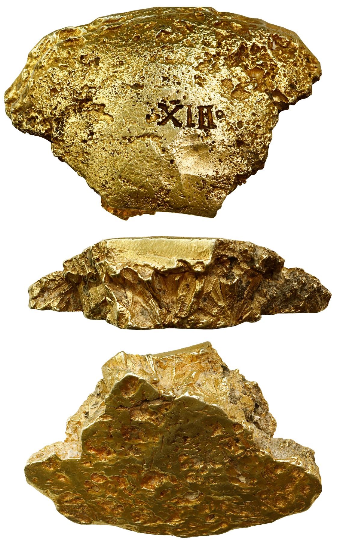 Quarter cut of a gold disk ingot, 952 grams, marked twice w/fineness XIIIo (13.25K), ex-1715 Fleet.
