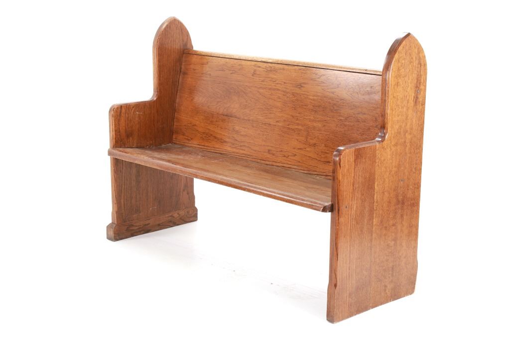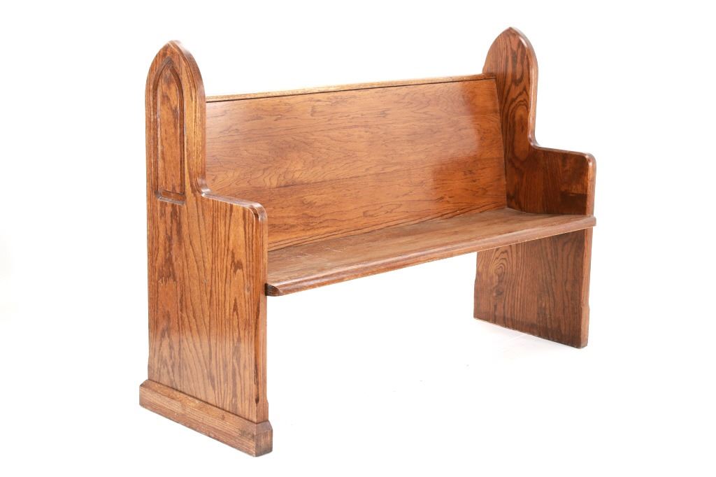 Offered in this lot is a Classic Solid Quarter-sawn Gothic Revival Oak Pew / Hall Bench. Curved back Gothic ends. A nice piece for the entryway, foyer, hallway, bedroom, dining table or wherever you might want to sit and reflect or put on your shoes. A stained, quarter-sawn oak bench in church pew style is perfect for generations to come and enjoy. This would look wonderful as the seating behind a sweethearts table at a wedding, then make a beautiful reminder of the day as a focal piece in your home. This pew bench is in good overall condition, slight scuffing noted. Measures 54.5"L x 39.25"H x 19.5"D.*