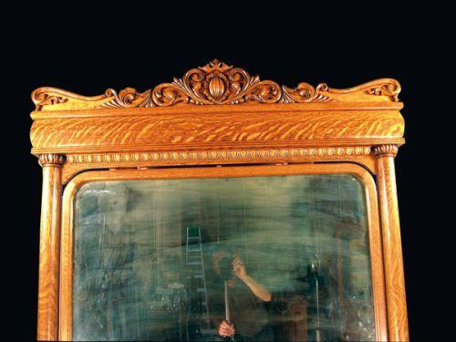 Quarter sawn Oak Lowboy Dresser with carved lions head and original hardware. Excellent restored condition. 89 X 52 X 25 inches.