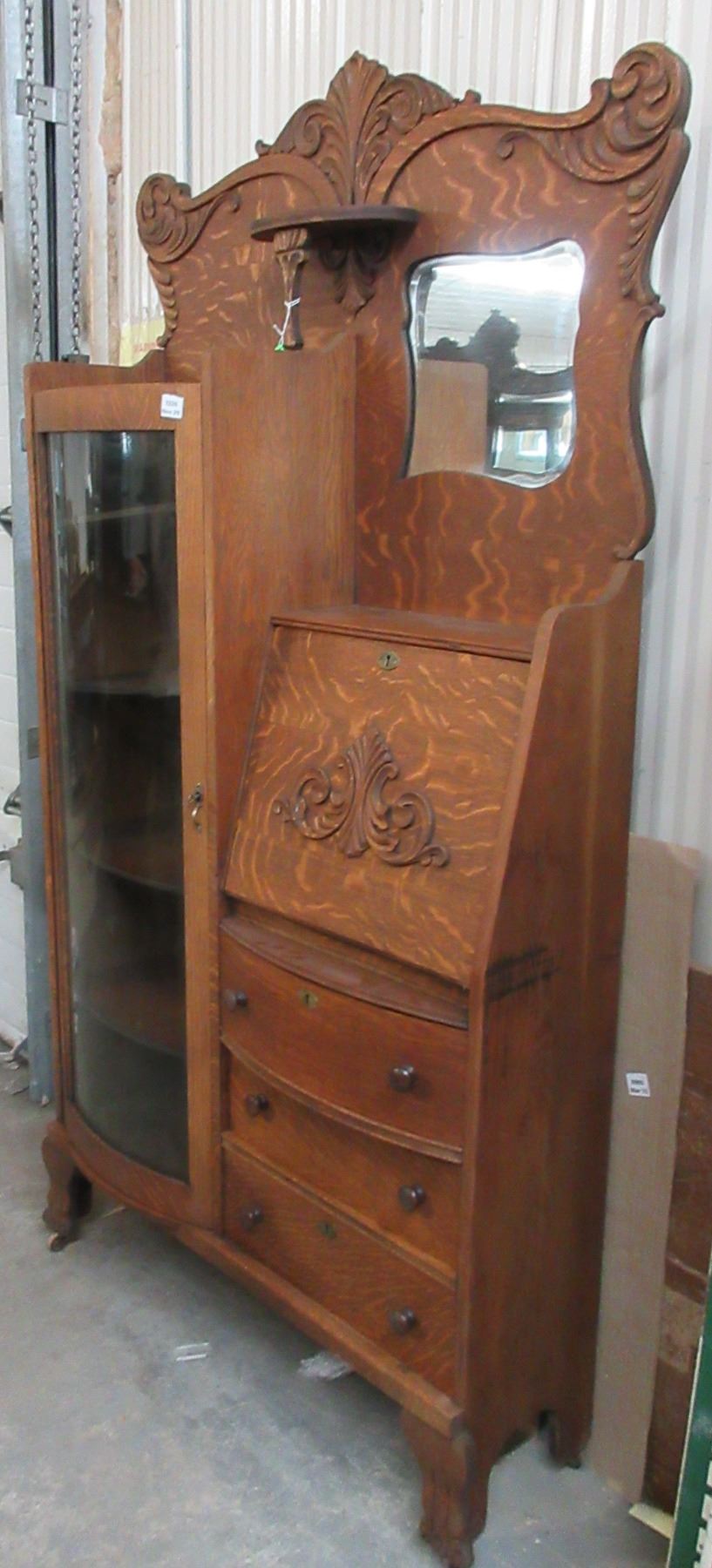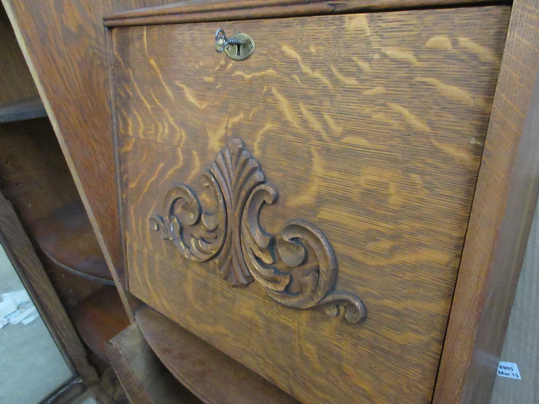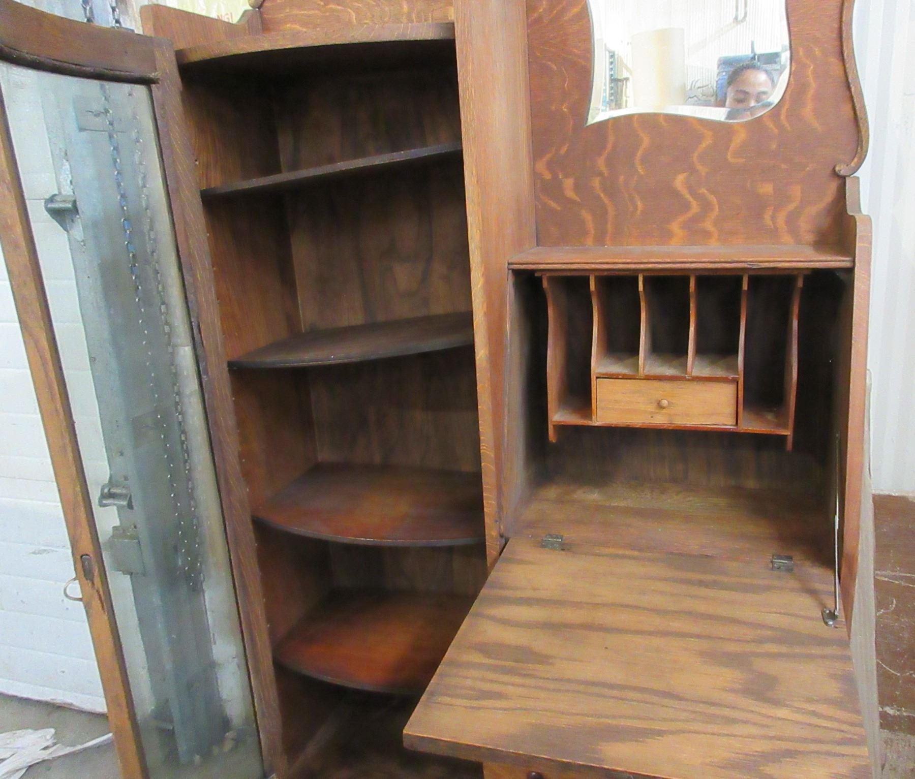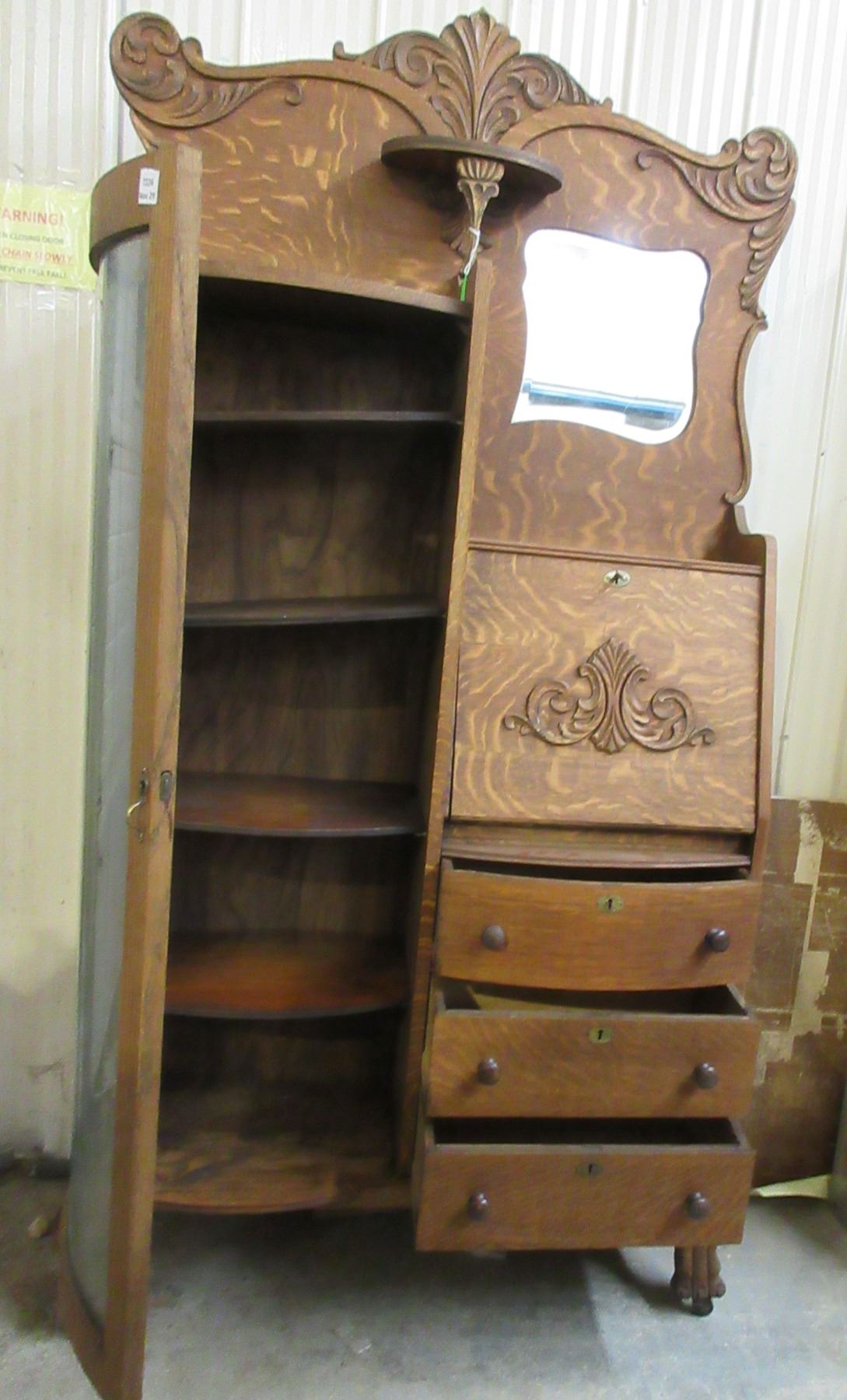 Quarter sawn oak lq curved glass 4 shelf secretary with key