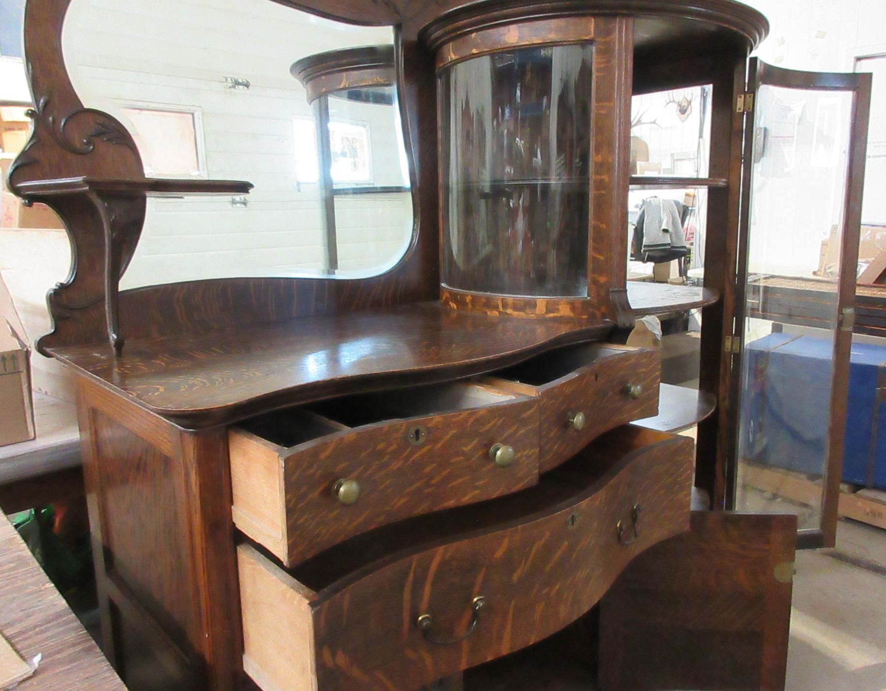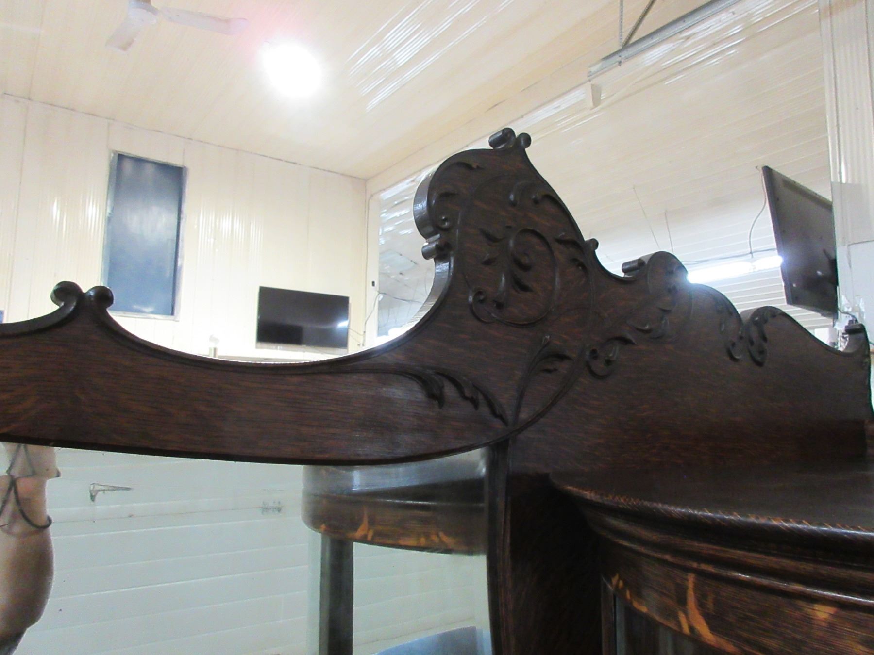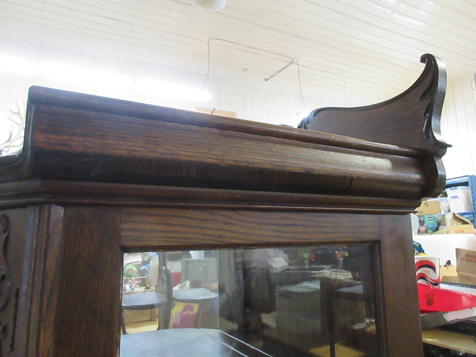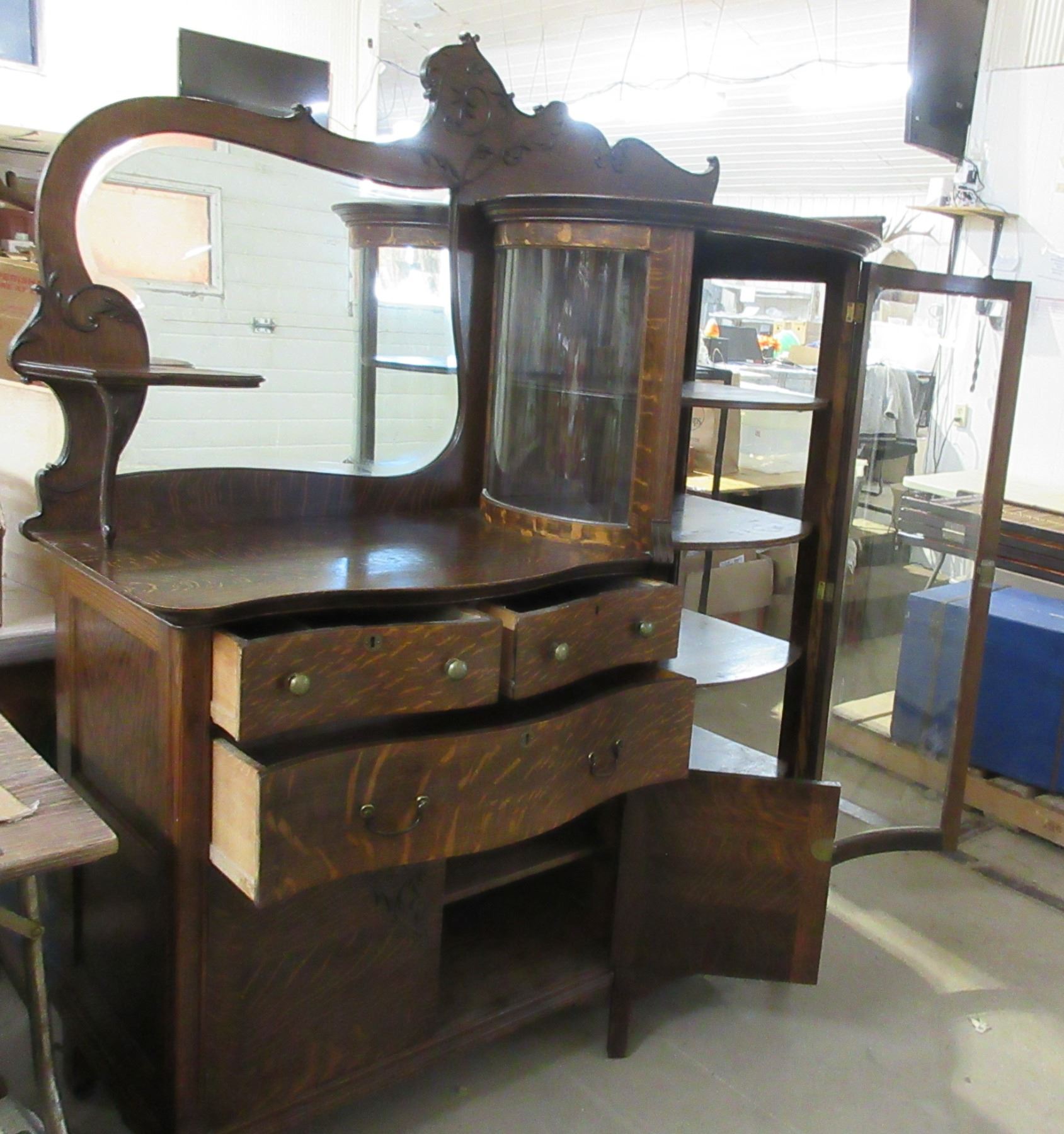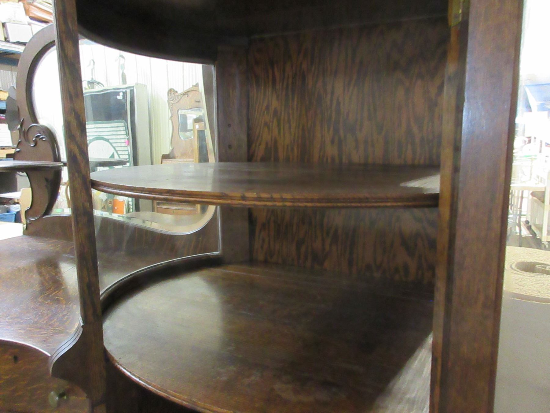 Quarter sawn oak lq curved glass China cabnet with shelves and key original finish