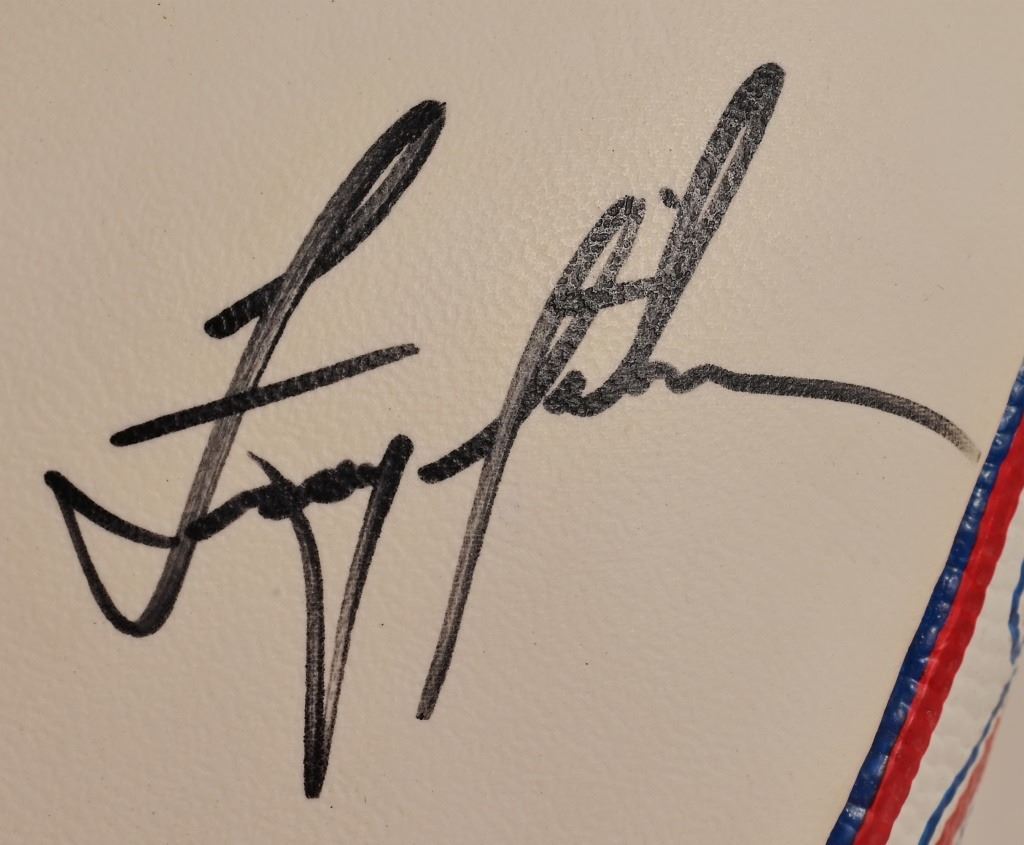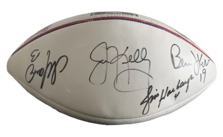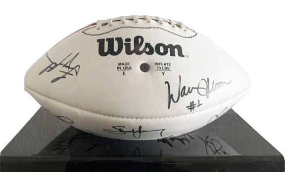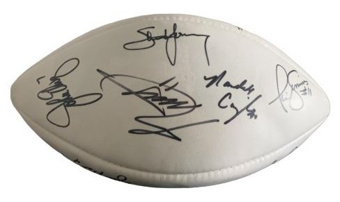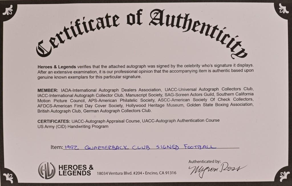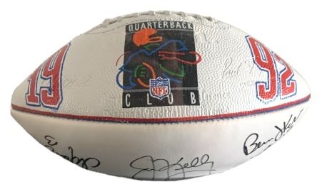 Quarterback Club 1992 signed football autographed by Warren Moon, Troy Aikman, Randall Cunningham, Steve Young, John Elway, Jim Everett, Dan Marino, Jim Kelly, Phil Simms, Jim Harbaugh and Bernie Kosar. JO122