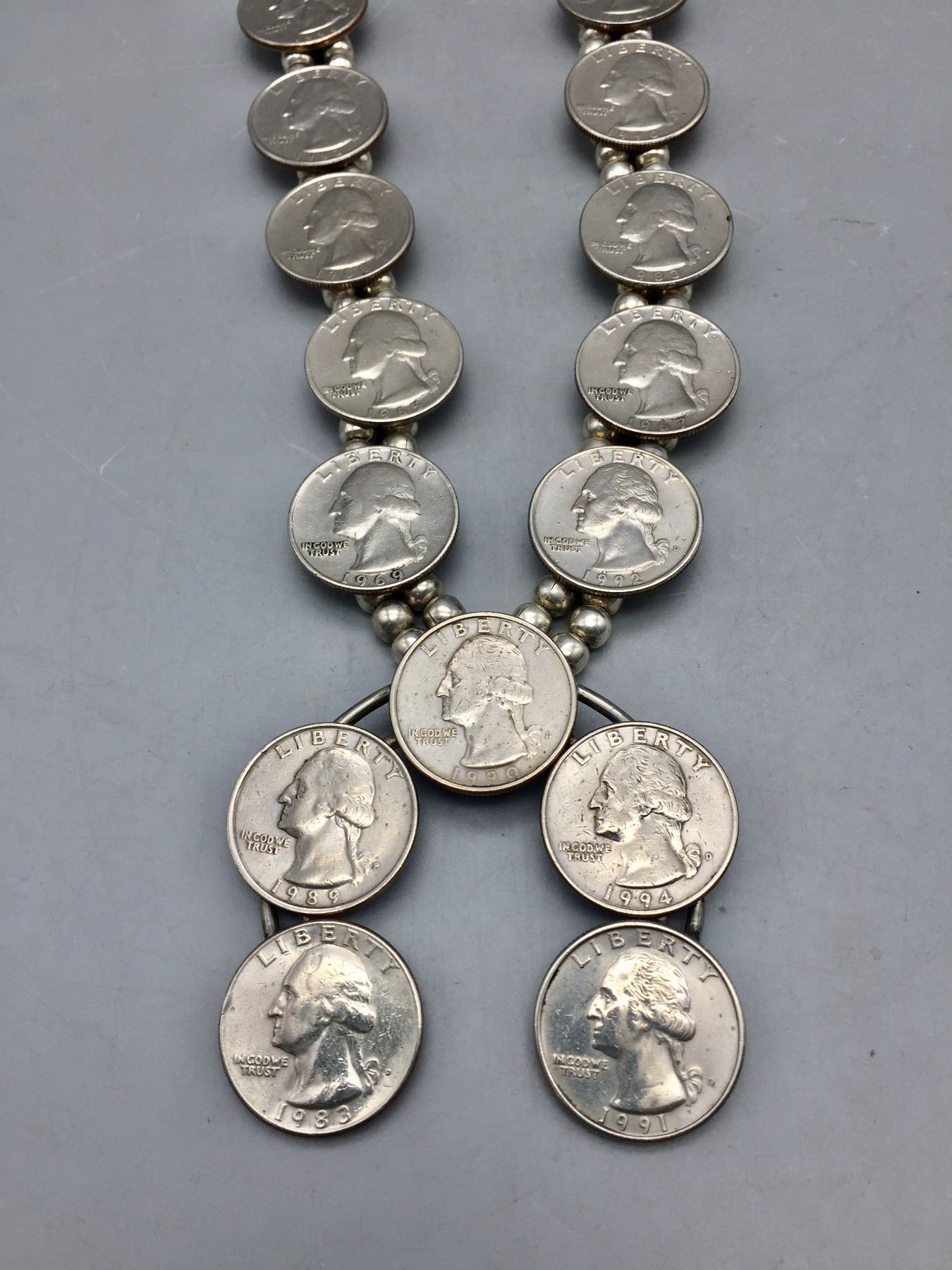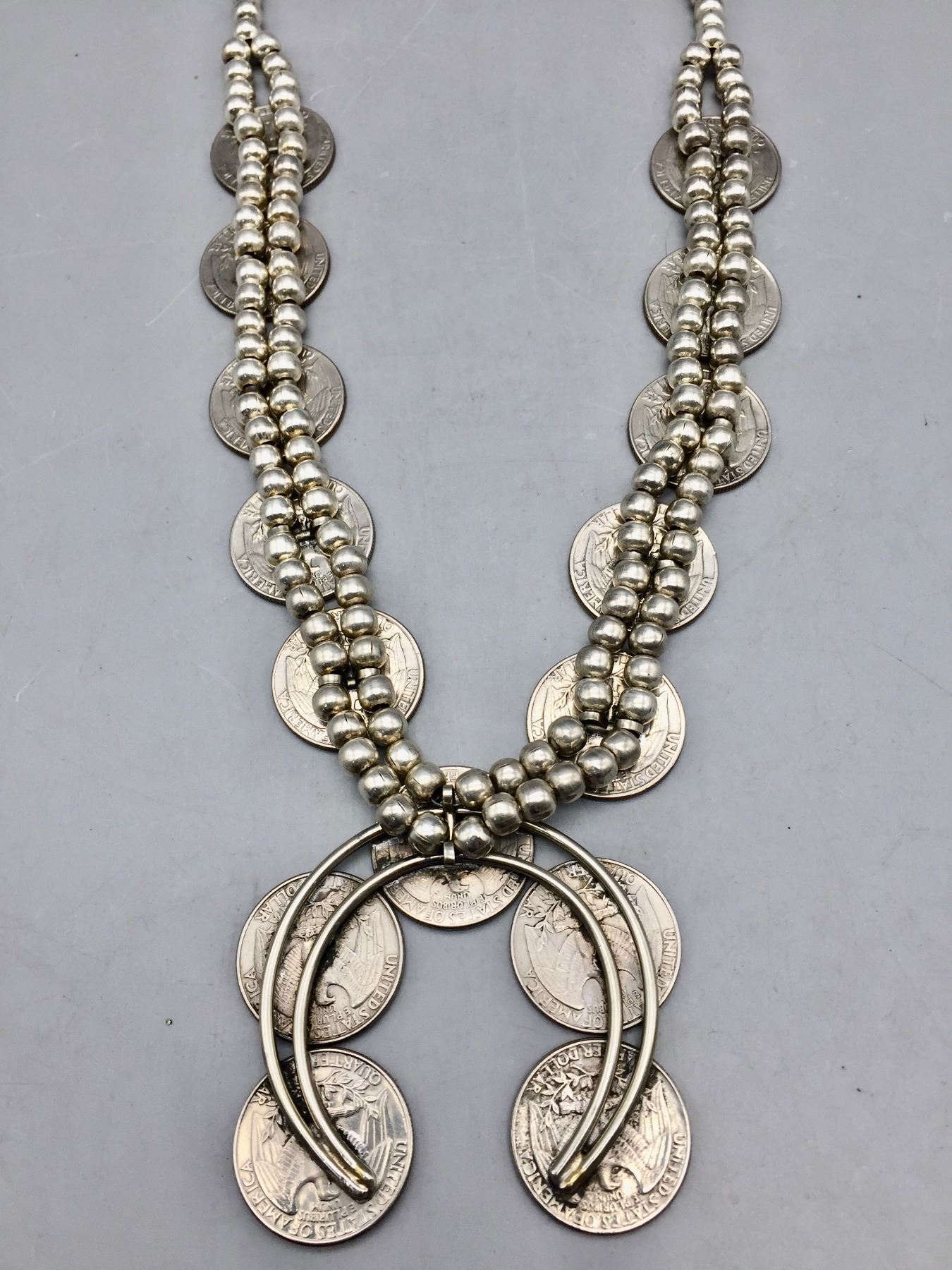 Description: Offered for sale in this lot is a squash blossom style necklace featuring quarters on the necklace and around the naja. Beads are non-sterling. Maker: No hallmark. Approx. Age: Fairly modern. Size: Fits a 23” neck. Naja measures 2-1/2”w x 2-1/2” tall. Weighs 148.3 grams. Condition: Good for its age, normal wear expected. Please look closely at the pictures - they are an important part of our description. Shipping: There will be a $5 handling / packaging fee for shipping this lot. The actual cost of postage will be added on top of that.