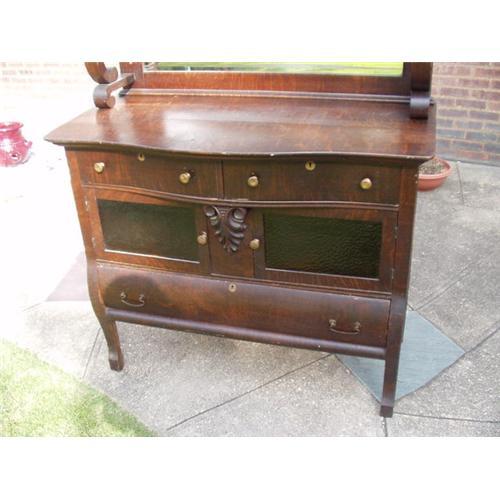 I am offering a beautiful Victorian/Arts and Crafts Quartersawn Oak Server. This is a transitional piece since I am uncertain if it either Victorian or from the Arts and Crafts period. Despite its age, it is in excellent condition and is made of gorgeous quartersawn oak. Also, this piece has original amber glass doors and scroll shelf with beveled mirror. Please zoom the photos and you will notice the striations in the quartersawn oak wood. I will assist with shipping or this item can be picked up at my shop.