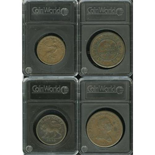 <B>Quartet of 19th Century British Tokens.</B></I> Two British halfpenny tokens dated 1812 and 1813 plus two other tokens dated 1811 and 1812. Viewing is recommended.<BR><BR><b>Shipping:</b> Coins & Currency (<a target="_blank" href="http://www.heritageauctions.com/common/shipping.php">view shipping information</a>)