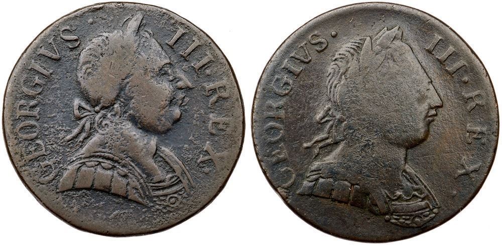 Grades are VG to XF. Includes three dated 1775 and one Britons Happy Isle (Atkins-60). The first 3 have a readable date, the last is undated. Lot of 4 coins.
