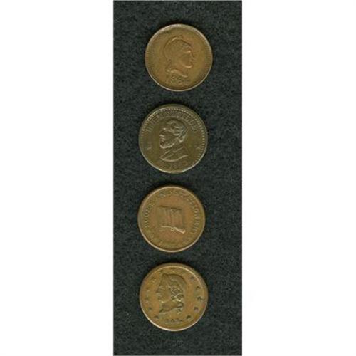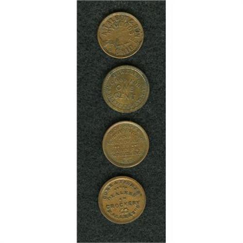 <B>Quartet of Civil War Merchant Tokens.</B></I> Four tokens, <B>Fuld-MI530B-2a, R.4; NY630AW-1a, R.4; OH50B-1a, R.5; </B></I>and <B>WV890D-4a, R.6.</B></I><BR><BR><b>Shipping:</b> Coins & Currency (<a target="_blank" href="http://www.heritageauctions.com/common/shipping.php">view shipping information</a>)