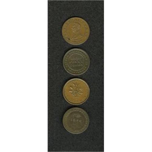 <B>Quartet of Early Tokens, </B></I>Half Penny 1813 Trade & Navigation, Charlton NS-21A3, third wave tallest, glossy brown VF, Lower Canada Un Sous ND (1835), VF with old-time scratches, Upper Canada 1816 Mule Charlton UC-7, F-VF and scarce, and Montreal Half Penny 1816, Charlton LC-12, nice brown VF. <B>Sold as is, no return lot.</B></I><BR><BR><b>Shipping:</b> Coin/Currency (<a target="_blank" href="http://www.heritageauctions.com/common/shipping.php">view shipping information</a>)